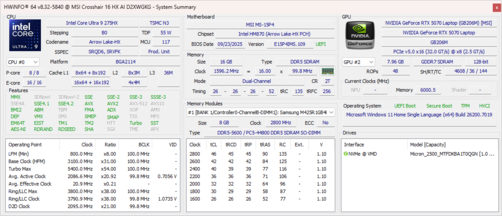 Notre Crosshair 16 HX AI est équipé d'un Core Ultra 9 275HX et d'un GPU RTX 5070 Laptop de 115 W, de 16 Go de mémoire DDR5-5600, d'un SSD NVMe de 1 To et d'un écran QHD+ 240 Hz de niveau IPS dans un boîtier familier Crosshair 16 HX D14 châssis.