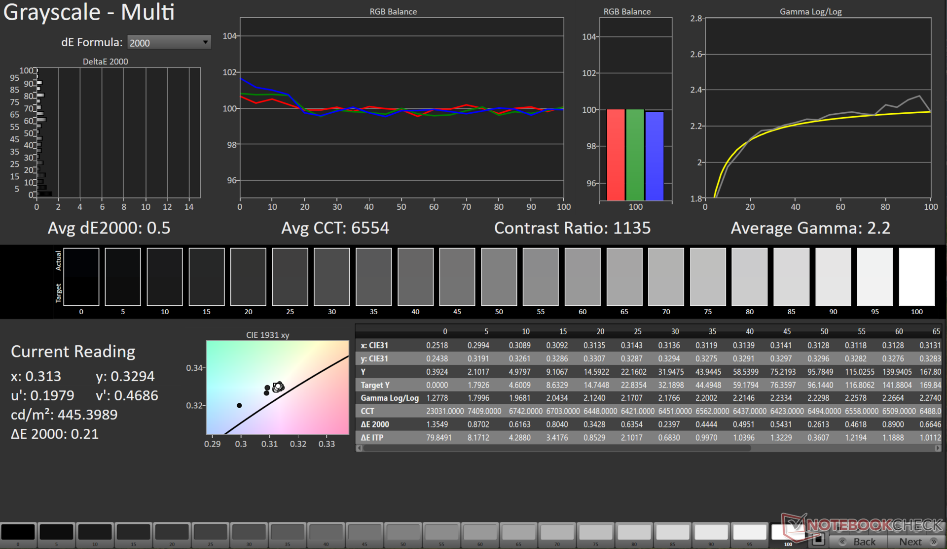 Le rapport de contraste mesuré de 1 180:1 se prête à une expérience visuelle subjectivement bonne avec une couverture presque complète de la gamme de couleurs sRGB et Display P3.