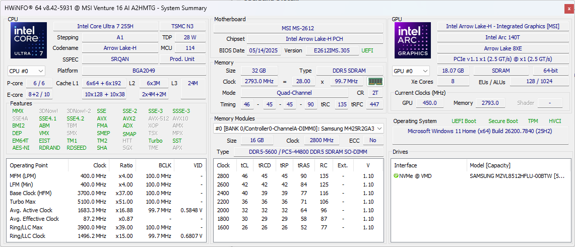 | MSI Venture 16 AI A2HMTG Intel Core Ultra 7 255H ⎘ Intel Arc Graphics 140T ⎘ 32 Go Mémoire | Prix de liste: 1000 USD | 2.1 kg | 23.15 mm | 16.00" 1920x1200 142 PPI IPS | |