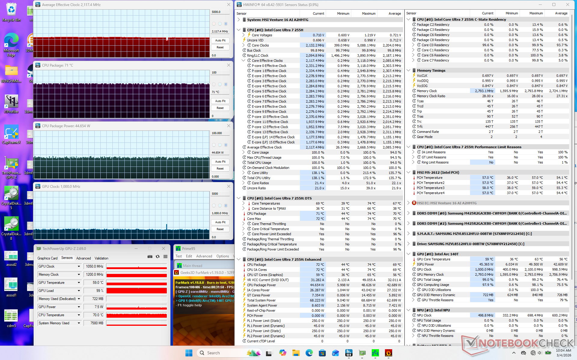 | Prime95 + FurMark Stress | 2.1 | 1000 | 71 |