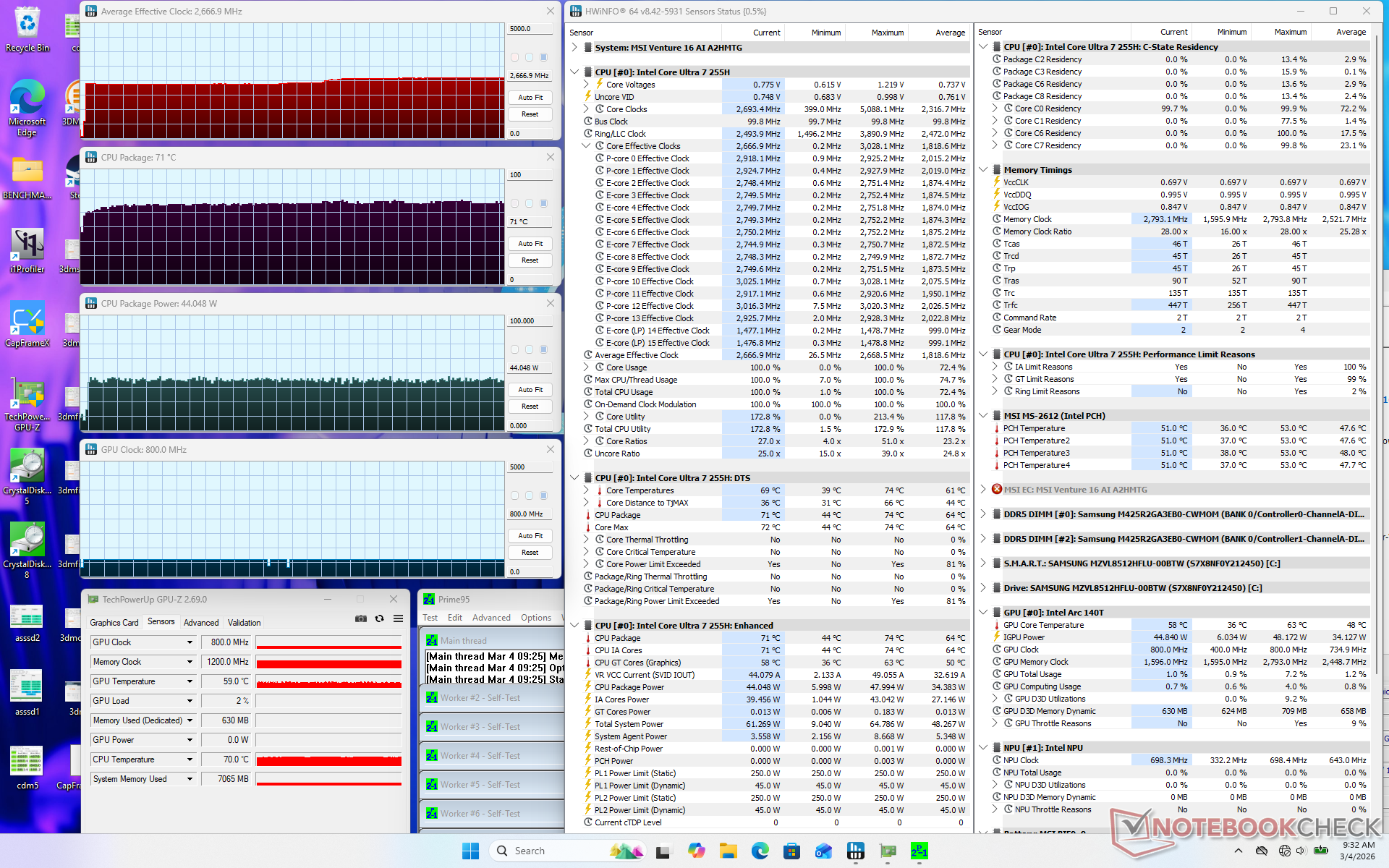 Le processeur s'est stabilisé à 2,7 GHz, 71 C et 44 W lors de l'initialisation du stress Prime95. La température du cœur reste dans la plage inférieure de 70 °C, même en cas de stress, par rapport à la plage moyenne de 80 °C sur le Prestige 16 équipé d'un processeur Core de la série H similaire.
