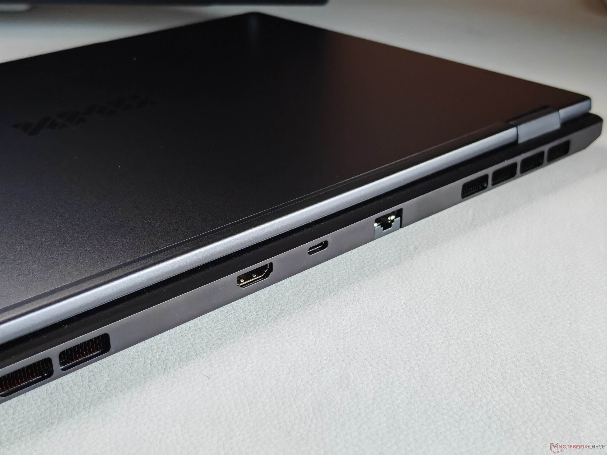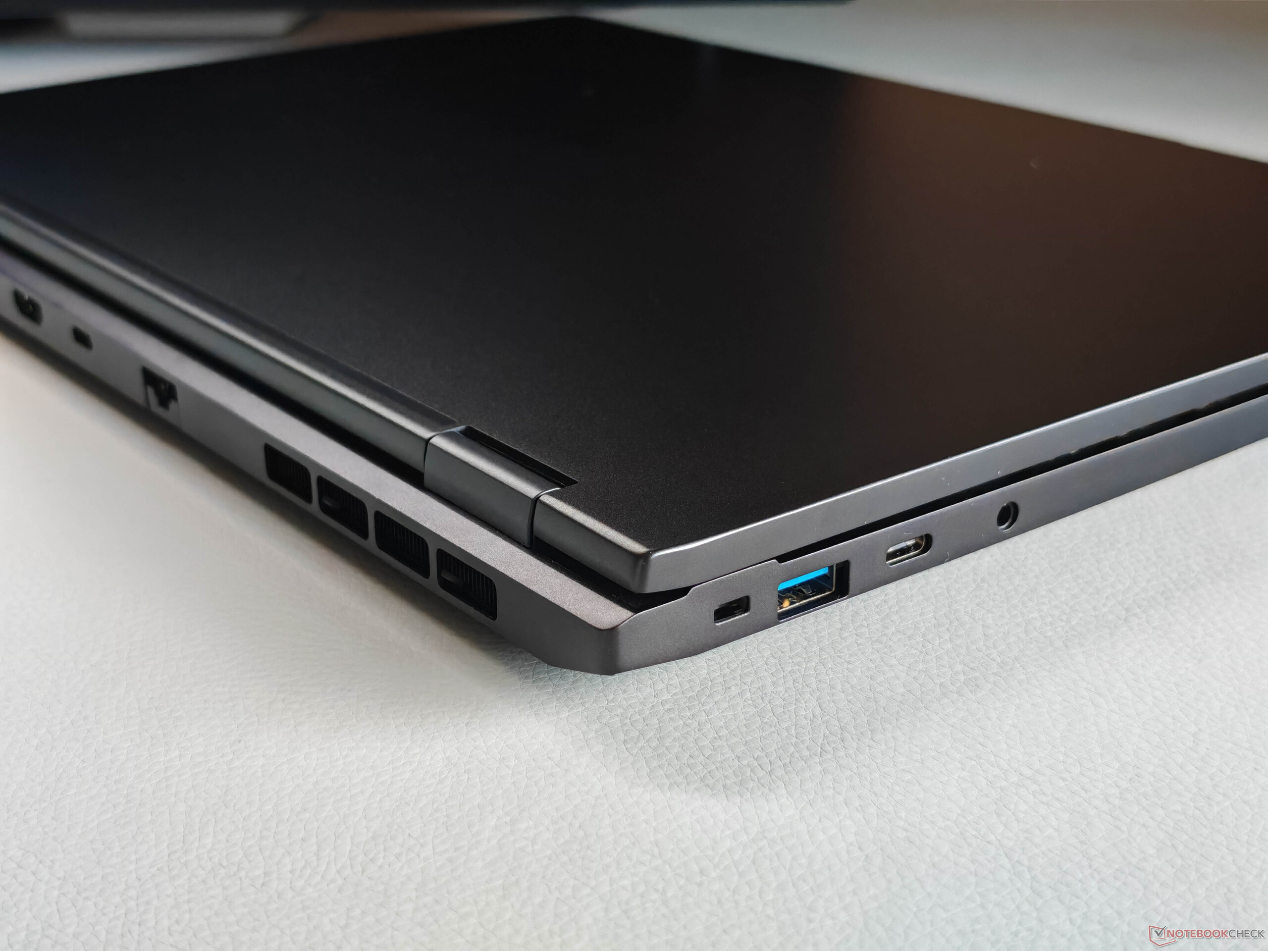 Le châssis n'a pas été modifié par rapport au modèle de l'année dernière le modèle de l'année dernièrel'Evo 15 reste un ordinateur portable très fin et de haute qualité. Le boîtier en aluminium noir est très bien construit et robuste, bien que les traces de doigts deviennent rapidement visibles. Les charnières (angle d'ouverture maximal) sont également bien réglées, avec une oscillation minimale.