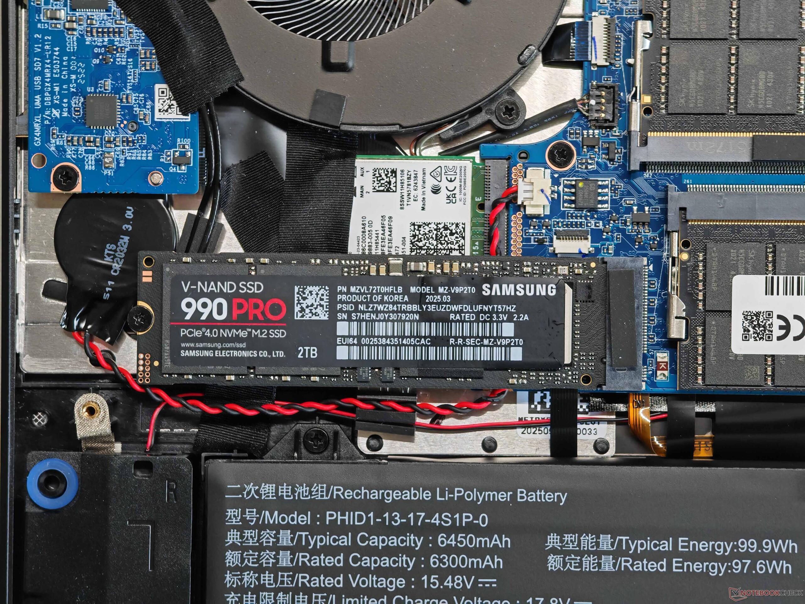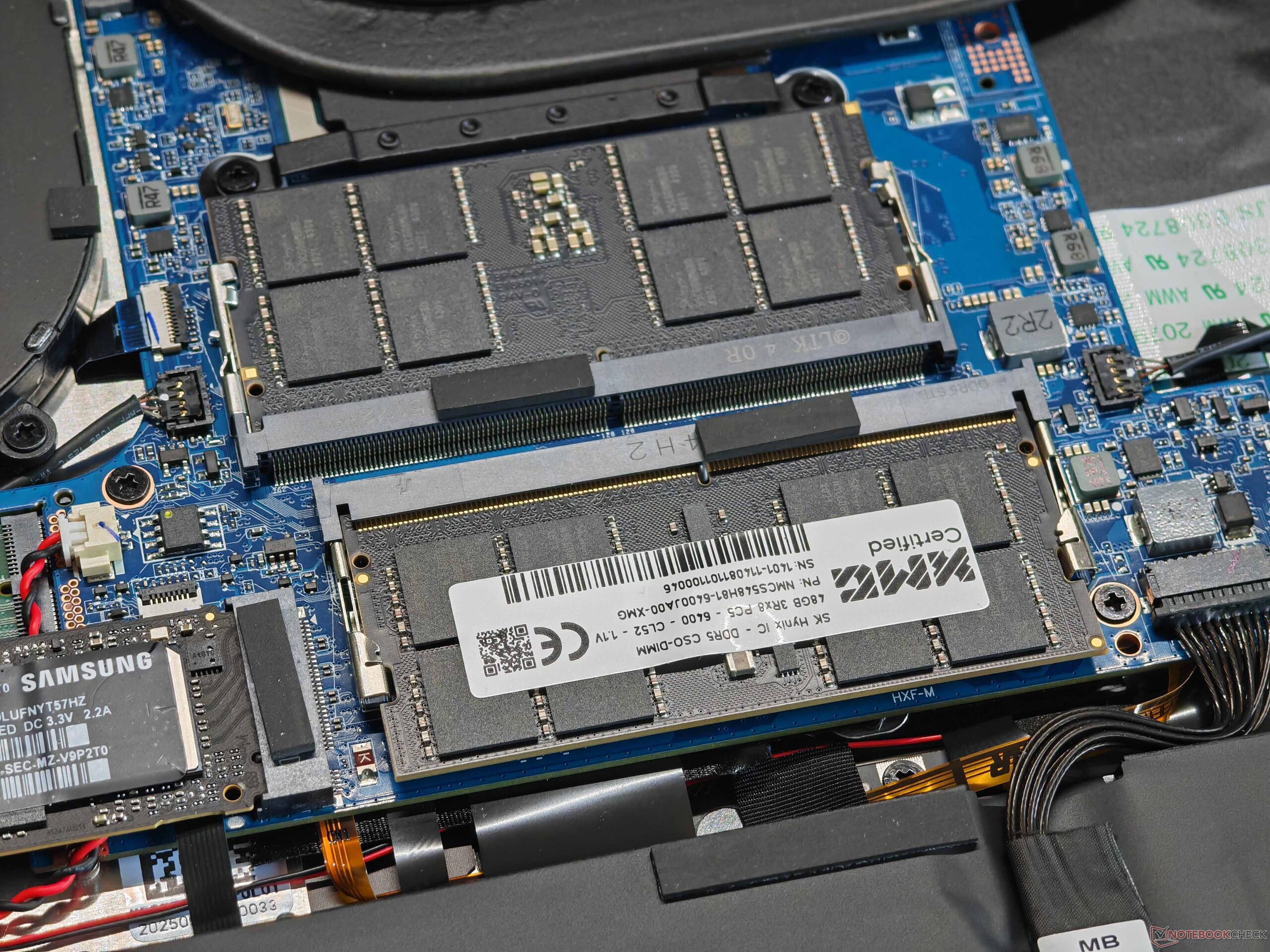 Les options de maintenance sont très bonnes, avec la prise en charge de deux emplacements SO-DIMM, de deux disques SSD et d'un module WLAN remplaçable ; un module Wi-Fi 7 est également disponible. Nous n'avons rencontré aucun problème de taux de transfert lors de nos tests. L'Evo 15 offre un large éventail de ports, dont Thunderbolt 4, HDMI et un lecteur de cartes de taille normale. La webcam 1080p (avec obturateur et module IR) est adéquate pour l'usage auquel elle est destinée.