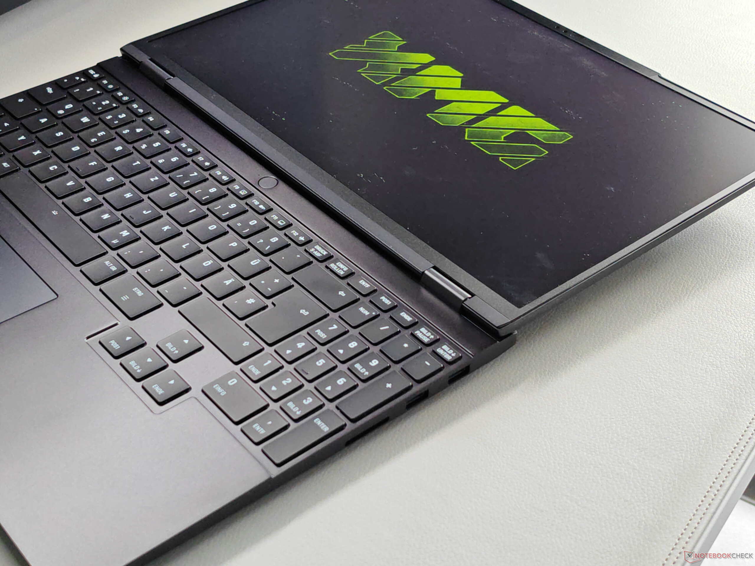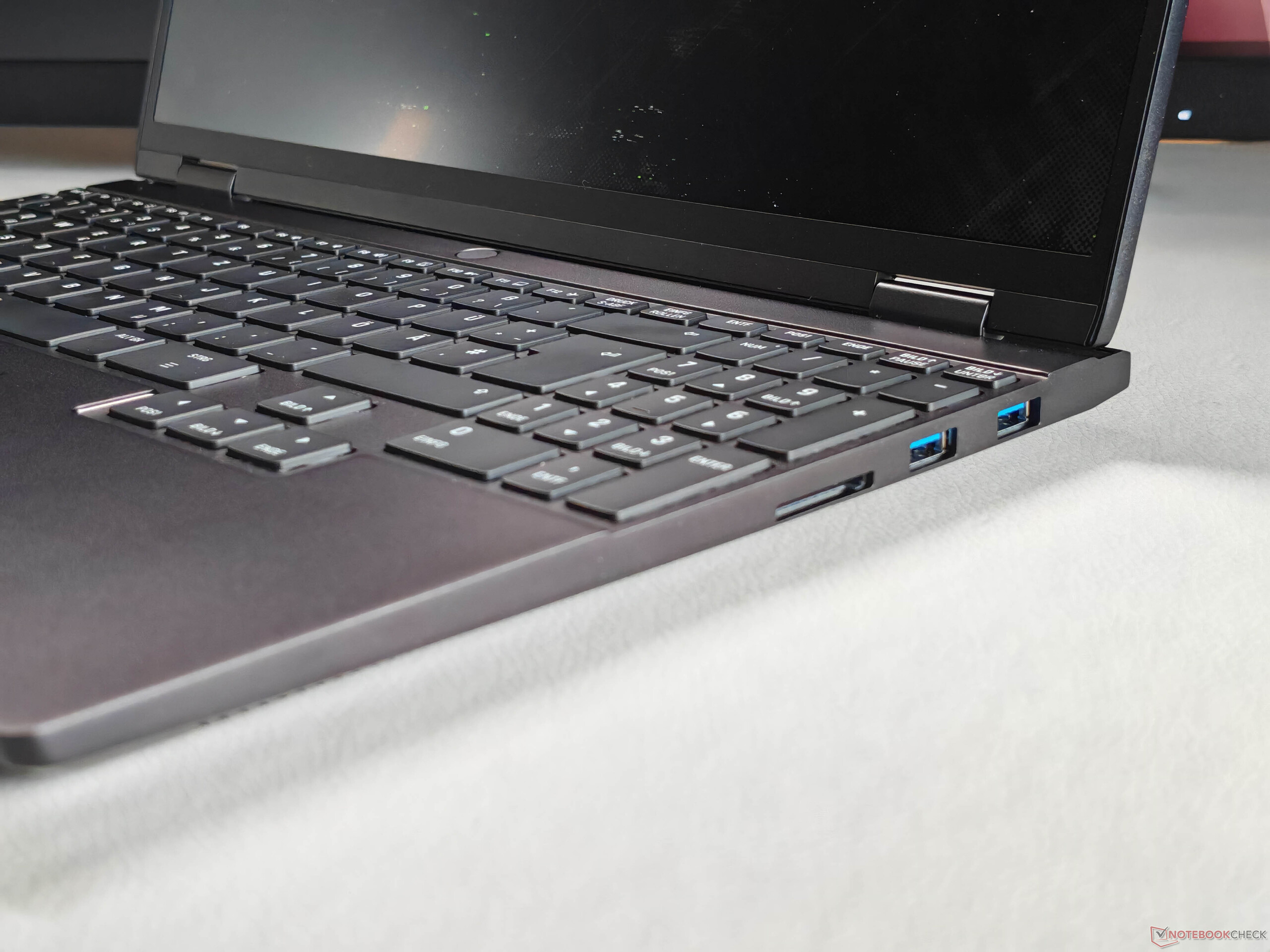Le clavier s'étend sur toute la largeur du châssis et comprend un pavé numérique dédié ainsi que de grandes touches fléchées. Dans l'ensemble, le confort de frappe est très bon et les textes longs peuvent être tapés sans problème ; seules les grandes touches sont légèrement plus bruyantes. Le rétroéclairage blanc offre quatre niveaux de luminosité.