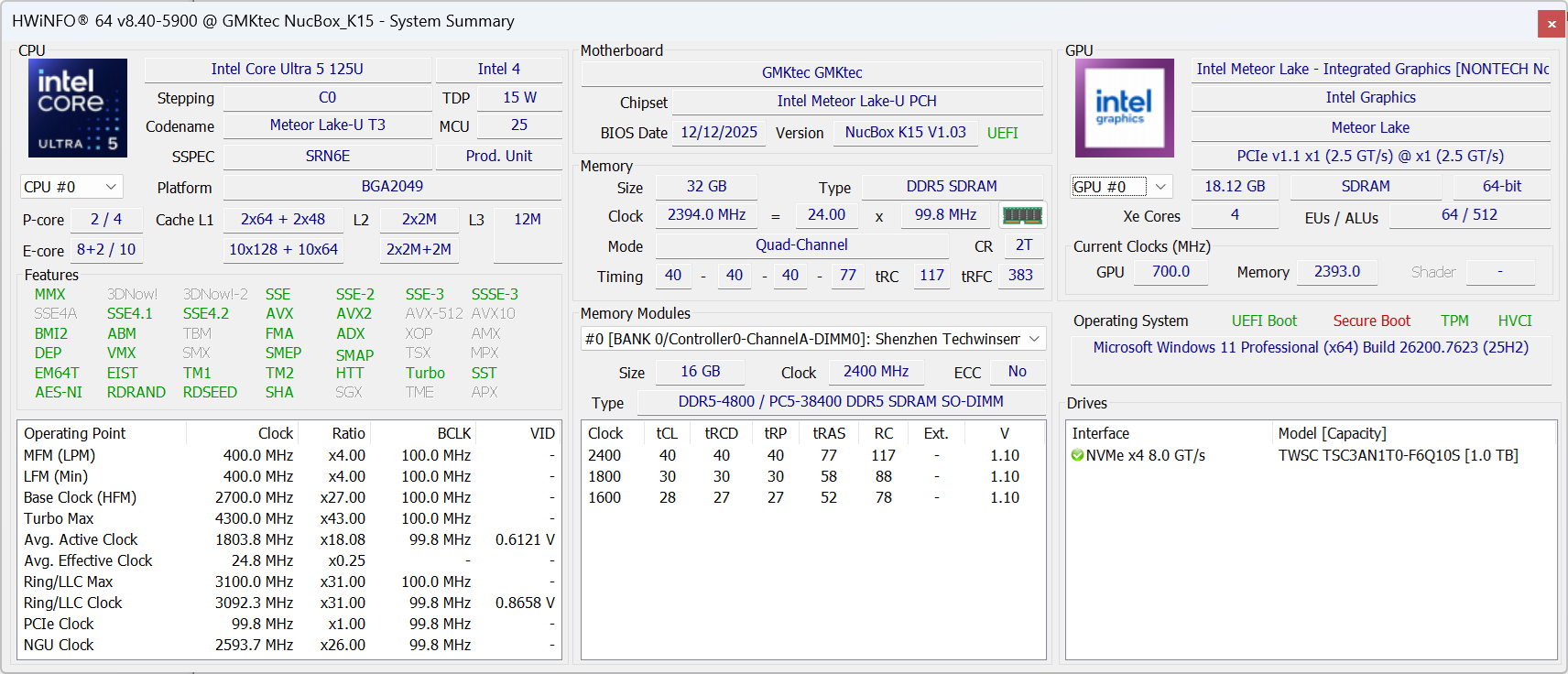 GMK expédie la même chose TWSC TSC3AN1T0-F6Q10S de milieu de gamme PCIe4 x4 NVMe SSD que l'on trouve sur la NucBox M7 Ultra pour la NucBox K15.