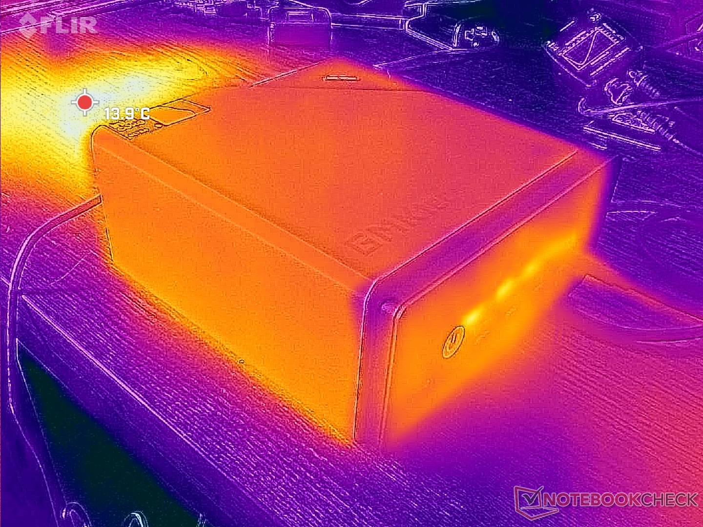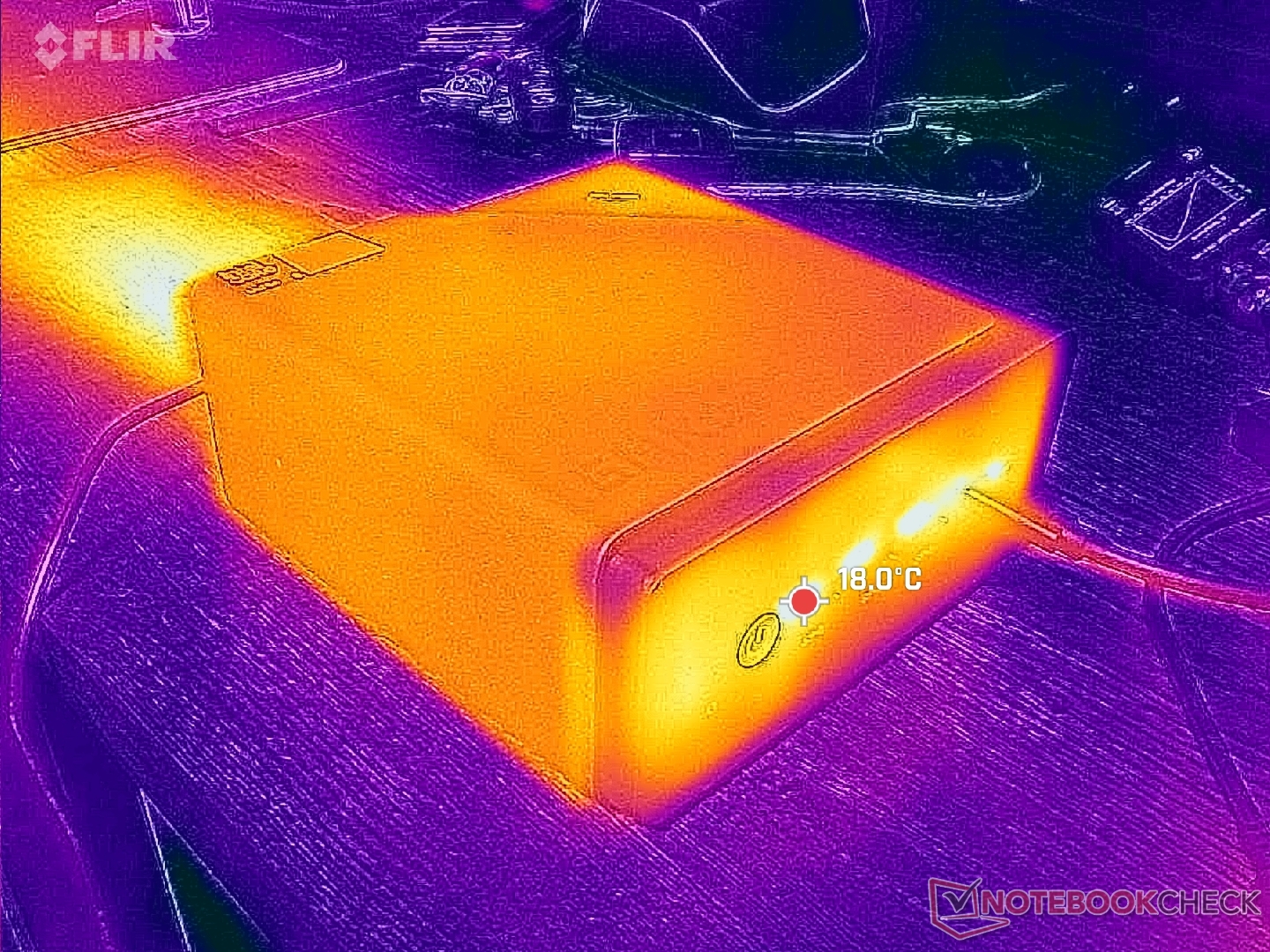 Les températures de surface sont parmi les plus basses de tous les mini-PC, grâce à l'association d'un processeur Core série U et d'un châssis relativement épais et large. Même la brique d'alimentation est surdimensionnée et les changements de température sont à peine perceptibles lorsqu'elle est en charge.