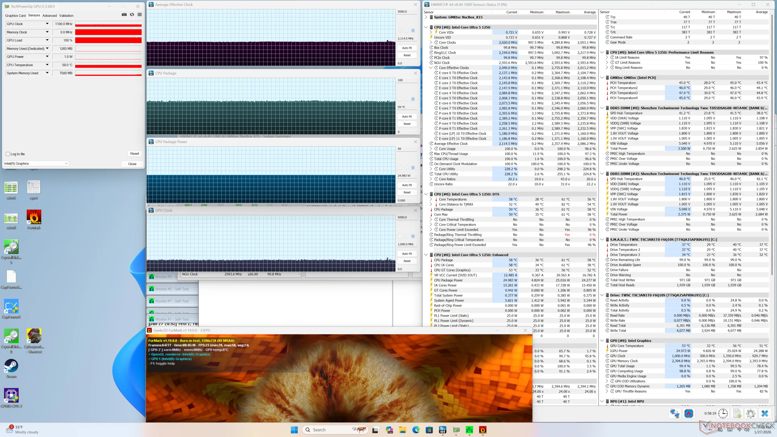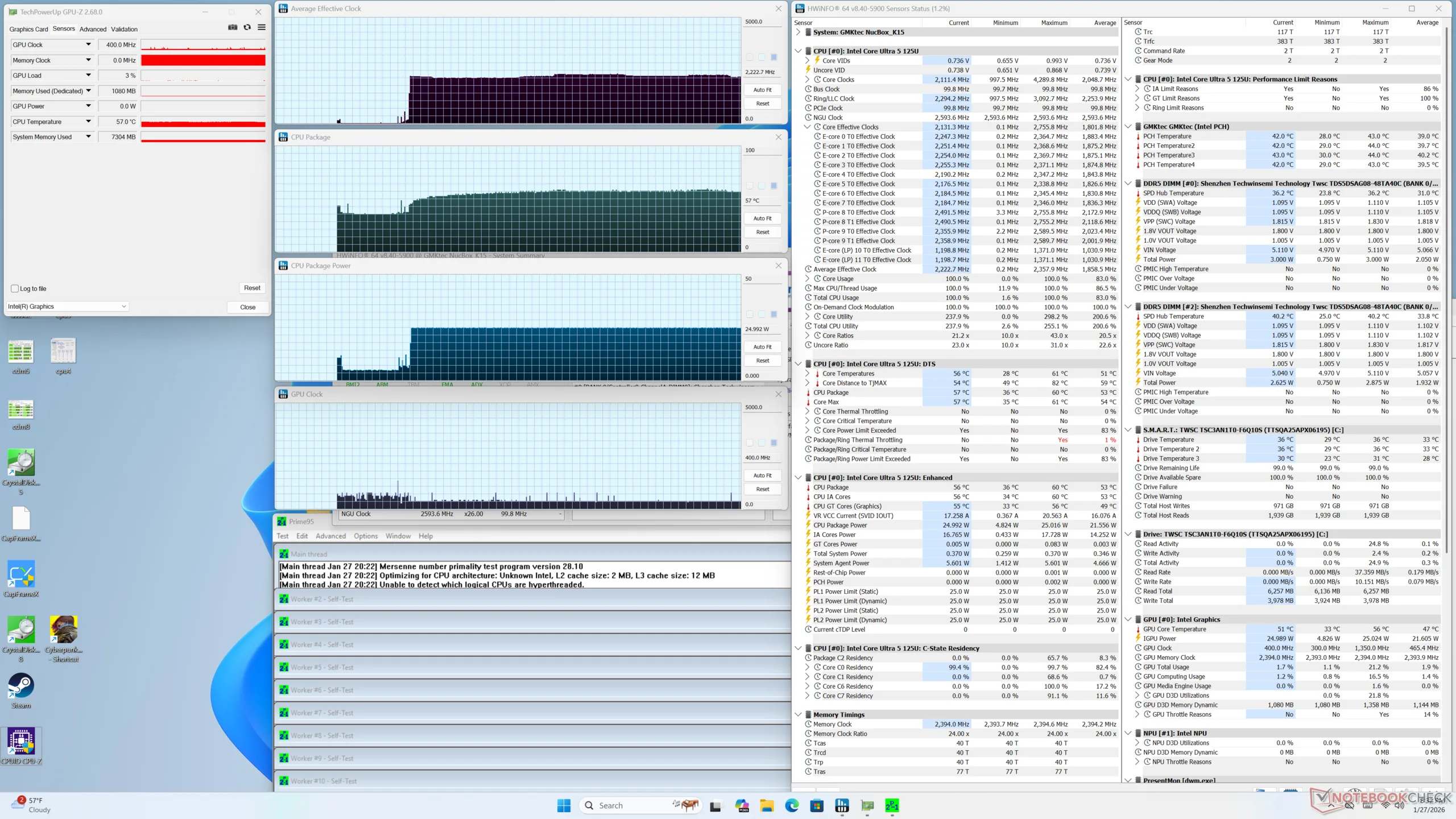 Le processeur se stabilise à 2,2 GHz, 57 C et 25 W lors de l'exécution de Prime95, contre 3,2 GHz, 66 C et 38 W sur le MSI Cubi NUC AI+ 2MG, plus cher et équipé de Lunar Lake. La température du cœur reste relativement basse, à moins de 60 °C, lors de l'exécution de Cyberpunk 2077 pour solliciter le GPU intégré.