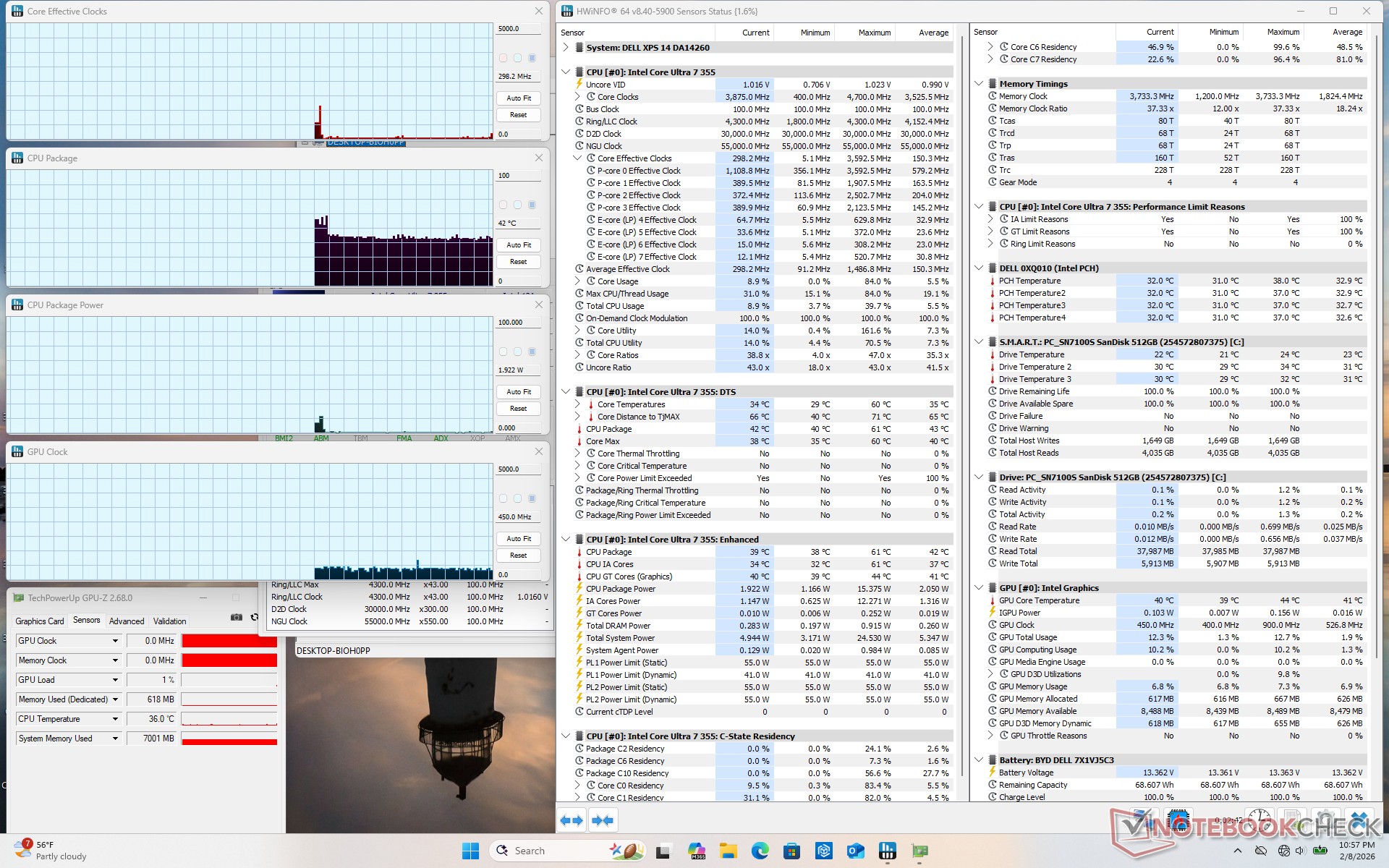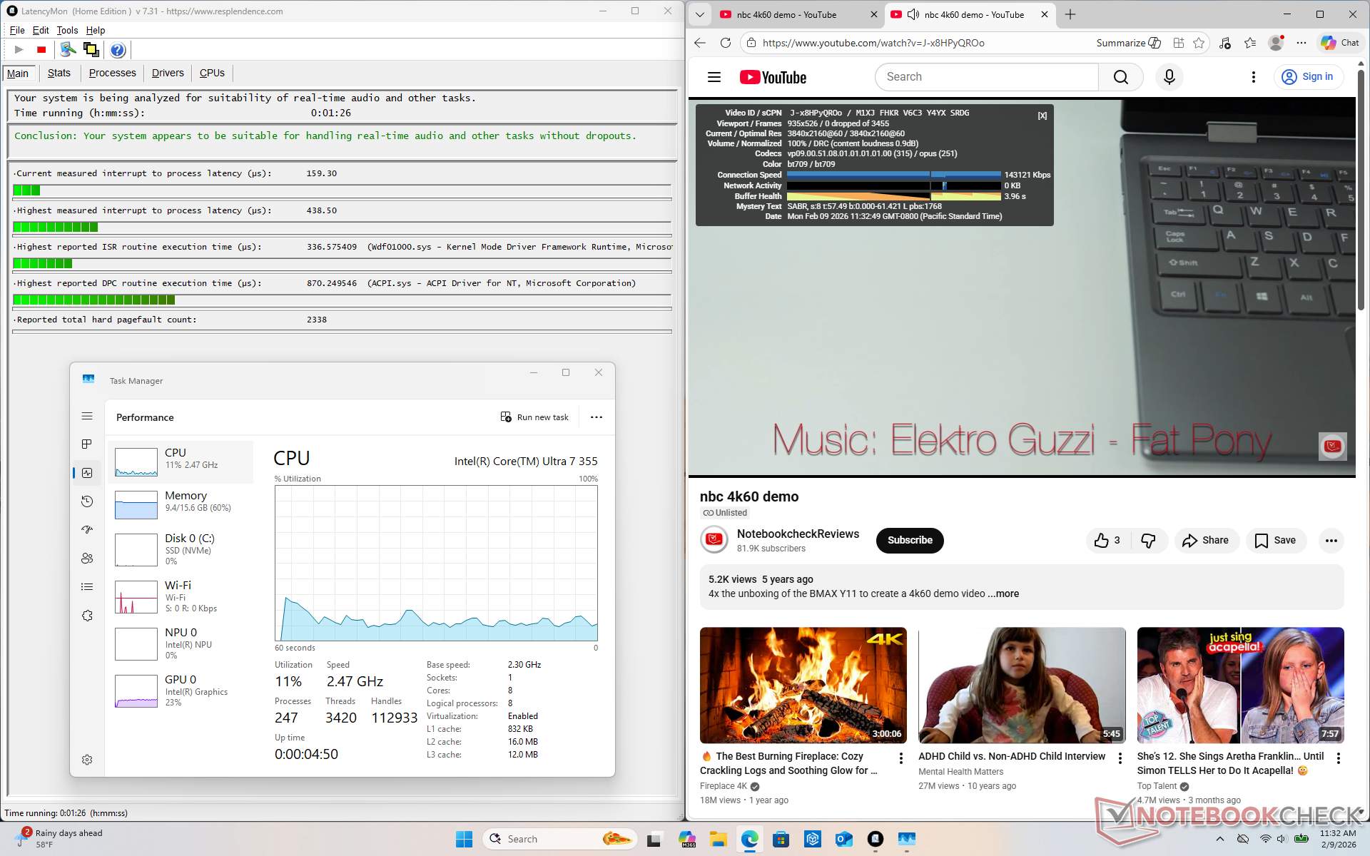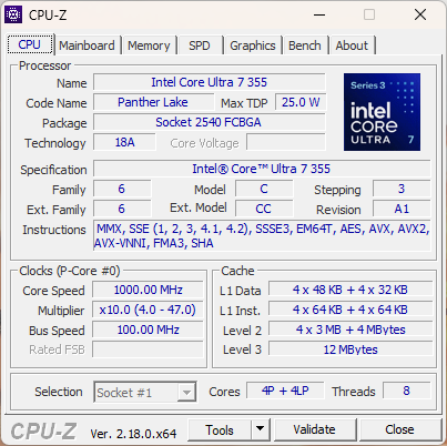 Le Core Ultra 7 355 perd une grande partie de ce qui fait la spécificité de la série H Panther Lake. En particulier, les performances et les performances par watt sont plus proches de Lunar Lake-V, voire pires, si l'on prend en compte les performances graphiques intégrées. Alors que le produit phare Core Ultra X7 358H est un énorme pas en avant pour la série, le Core Ultra 7 355 de milieu de gamme peut ressembler à un rebranding du Core Ultra 7 255U à bien des égards. Le système ne fonctionne pas sensiblement plus froid ou plus longtemps que l'option Core Ultra X7 plus rapide, malgré les différences de performances.