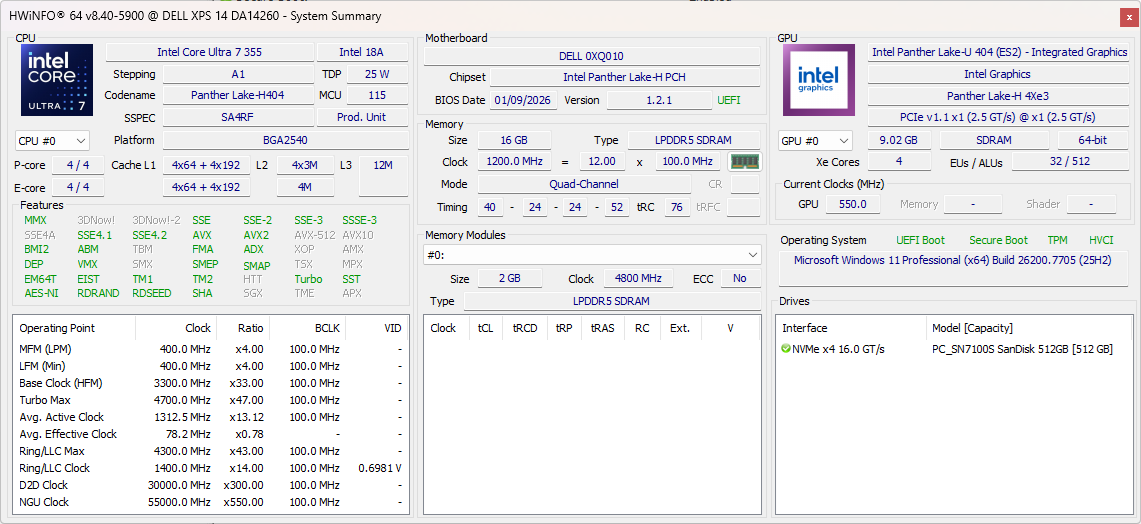 | Dell XPS 14 Core Ultra 7 355 Intel Core Ultra 7 355 ⎘ Intel Graphics 4 Xe3 Panther Lake iGPU ⎘ 16 Go Mémoire, 512 Go SSD | Amazon: Prix de liste: 1600 USD | 1.5 kg | 15.2 mm | 14.00" 1920x1200 162 PPI IPS | |