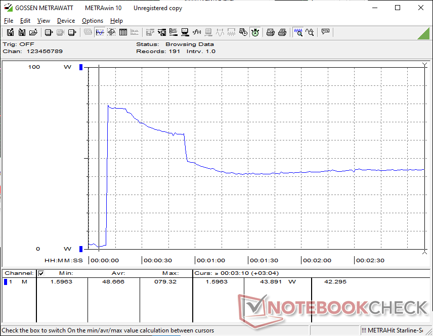 L'adaptateur secteur USB-C universel de 100 W est par ailleurs identique dans toutes les configurations du 2026 XPS 14. Cependant, le potentiel Turbo Boost étant plus faible sur le Core Ultra 7, nous ne pouvons atteindre qu'une consommation maximale de 80 W lorsque le CPU est pleinement sollicité, contre 101 W sur la configuration Core Ultra X7.