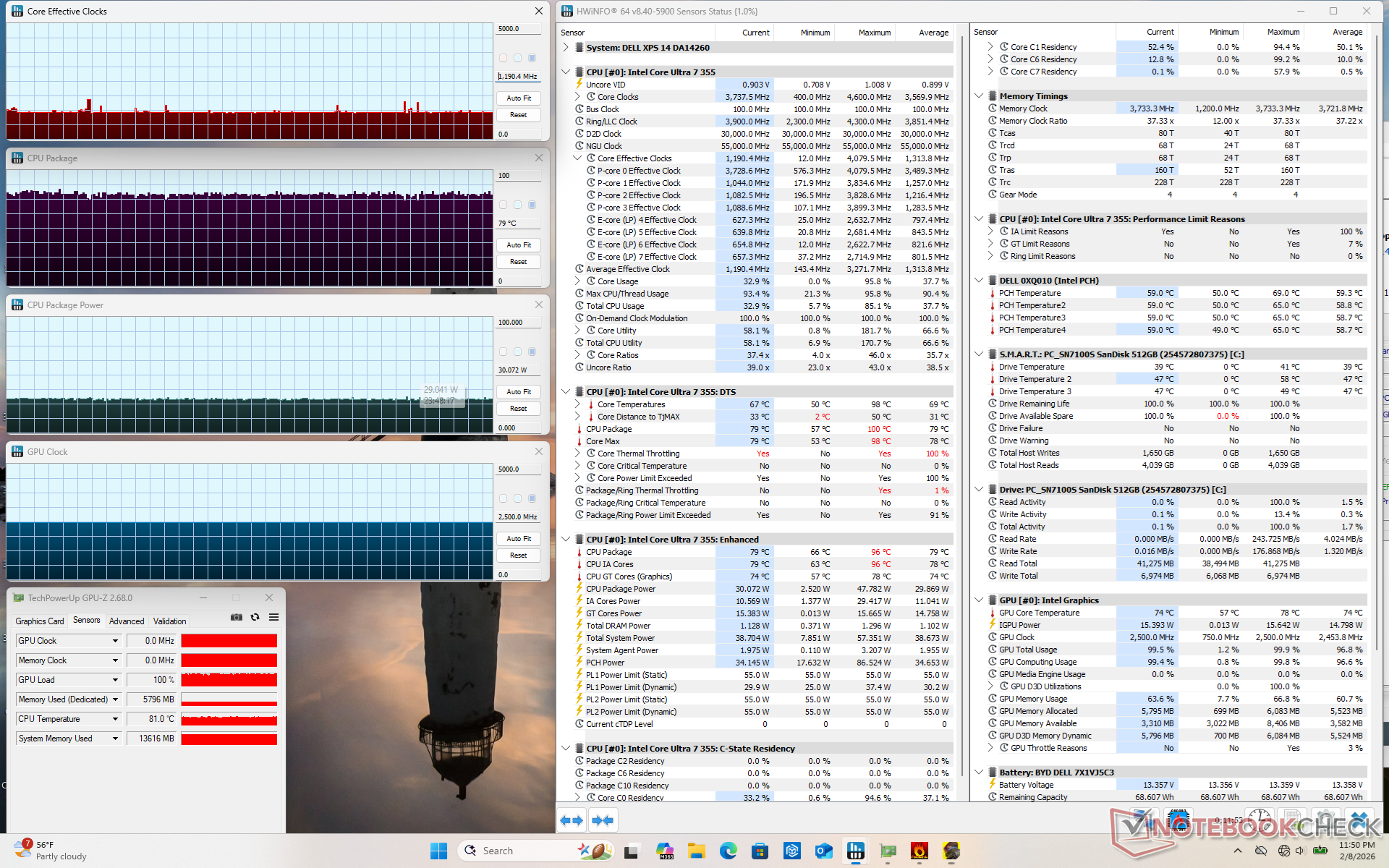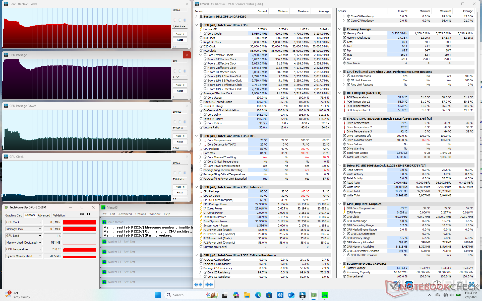 Lors de l'exécution de Prime95, le CPU atteint 3,7 GHz et 54 W pendant seulement quelques secondes à 100 C. Ensuite, il se stabilise à 2,9 GHz, 28 W et 81 C, ce qui représente un potentiel Turbo Boost limité. La température du cœur se stabilise à 80°C lors de l'exécution de charges exigeantes, ce qui est légèrement plus froid que ce que nous avons enregistré sur l'Arrow Lake-H de l'année dernière Dell 14 Premium.