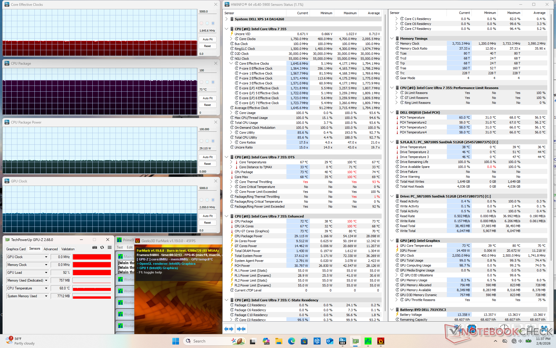 | Prime95 + FurMark Stress | 1.7 | 2050 | 73 |