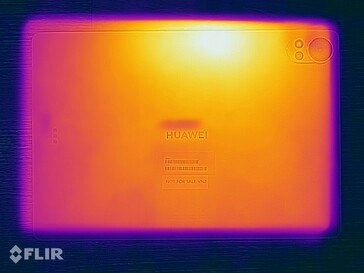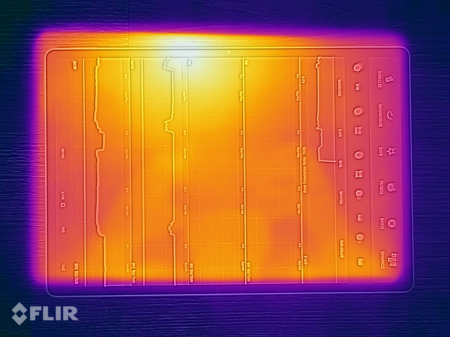 (±) La température maximale du côté supérieur est de 43.4 °C / 110 F, par rapport à la moyenne de 33.7 °C / 93 F, allant de 20.7 à 53.2 °C pour la classe Tablet.