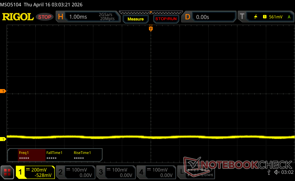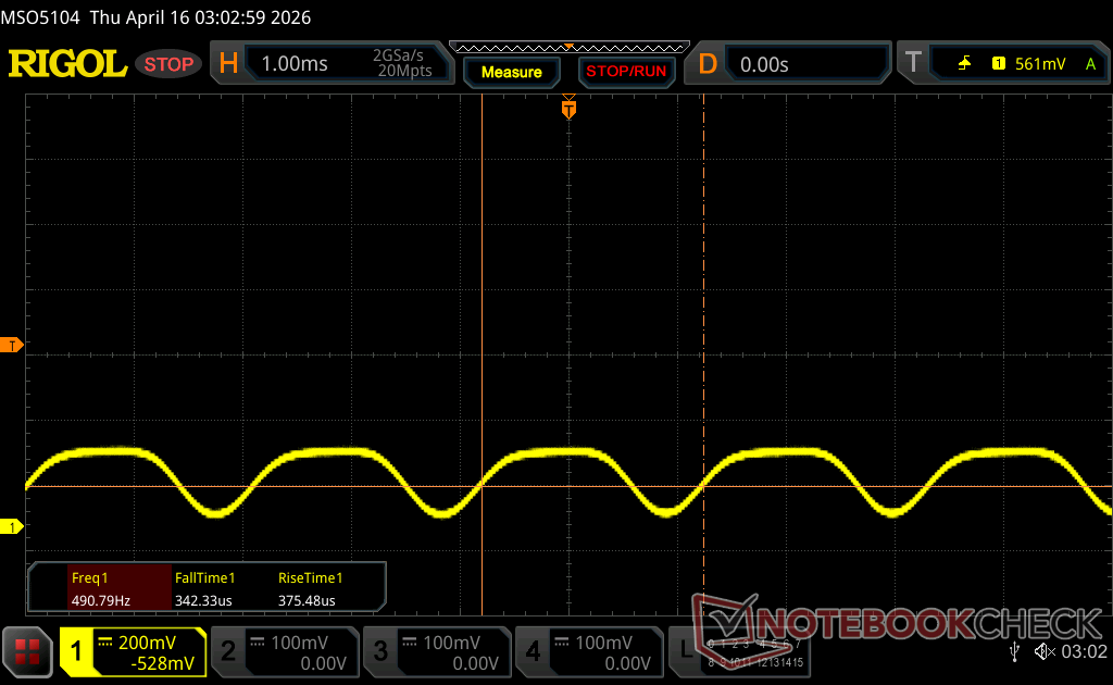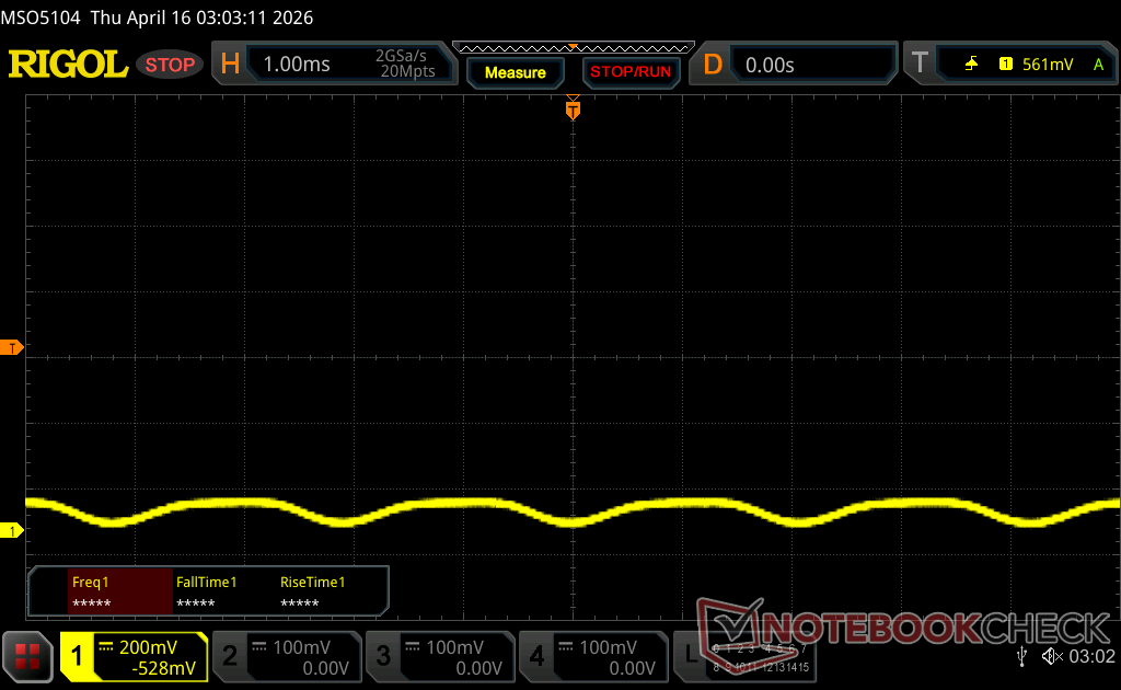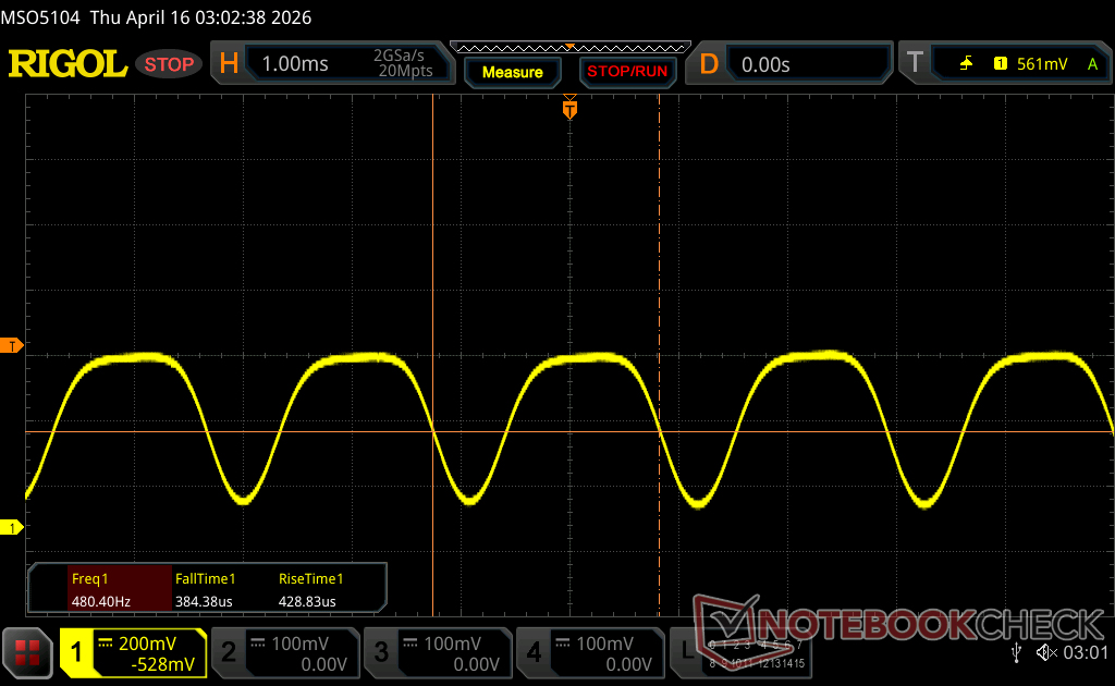 Le rétroéclairage de l'écran scintille à la fréquence de 479.46 Hz (certainement du fait de l'utilisation d'une MDI - Modulation de largeur d'impulsion) à un niveau de luminosité inférieur ou égal à 100 % . Aucun scintillement ne devrait être perceptible au-dessus de cette valeur. La fréquence de rafraîchissement de 479.46 Hz est relativement élevée, la grande majorité des utilisateurs ne devrait pas percevLa fréquence de rafraîchissement de 479.46 Hz est relativement élevée, la grande majorité des utilisateurs ne devrait pas percevoir de scintillements et être sujette à une fatigue oculaire accrue.oir de scintillements et être sujette à une fatigue oculaire accrue. Néanmoins certaines personnes pourront toujours percevoir un scintillement. En comparaison, 52 % des appareils testés n'emploient pas MDI pour assombrir leur écran. Nous avons relevé une moyenne à 7898 (minimum : 5 - maximum : 343500) Hz dans le cas où une MDI était active. | |||