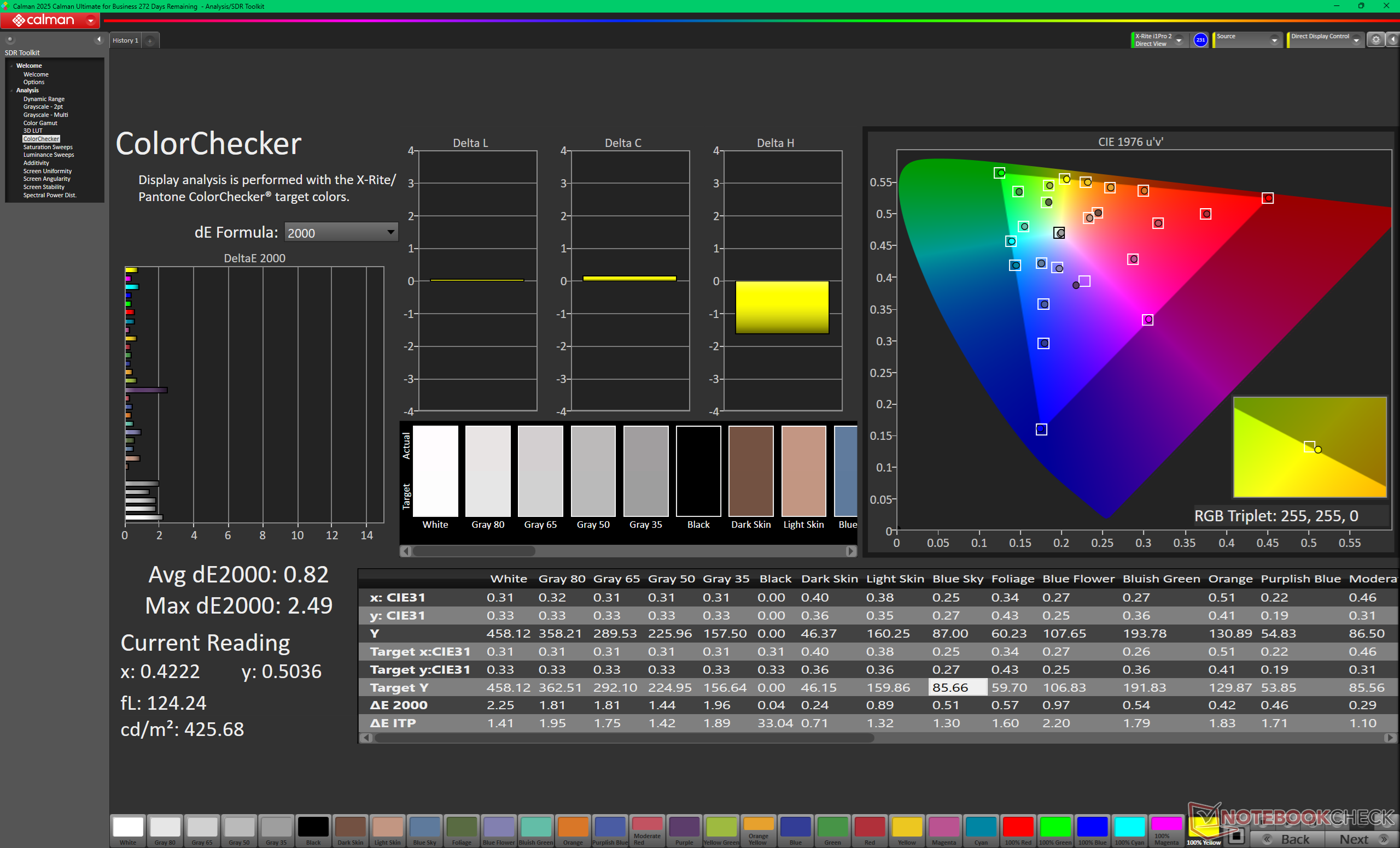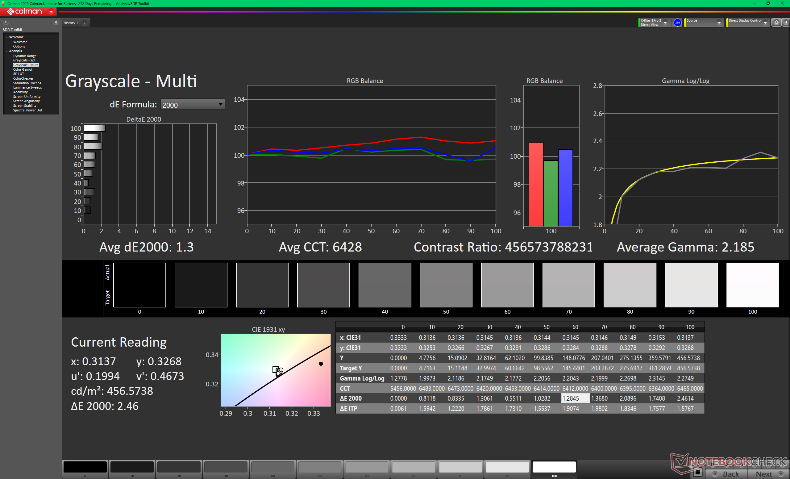L'écran est bien calibré par rapport à la norme P3, avec des valeurs moyennes de deltaE en niveaux de gris et en couleurs de seulement 0,6 et 2,21, respectivement.