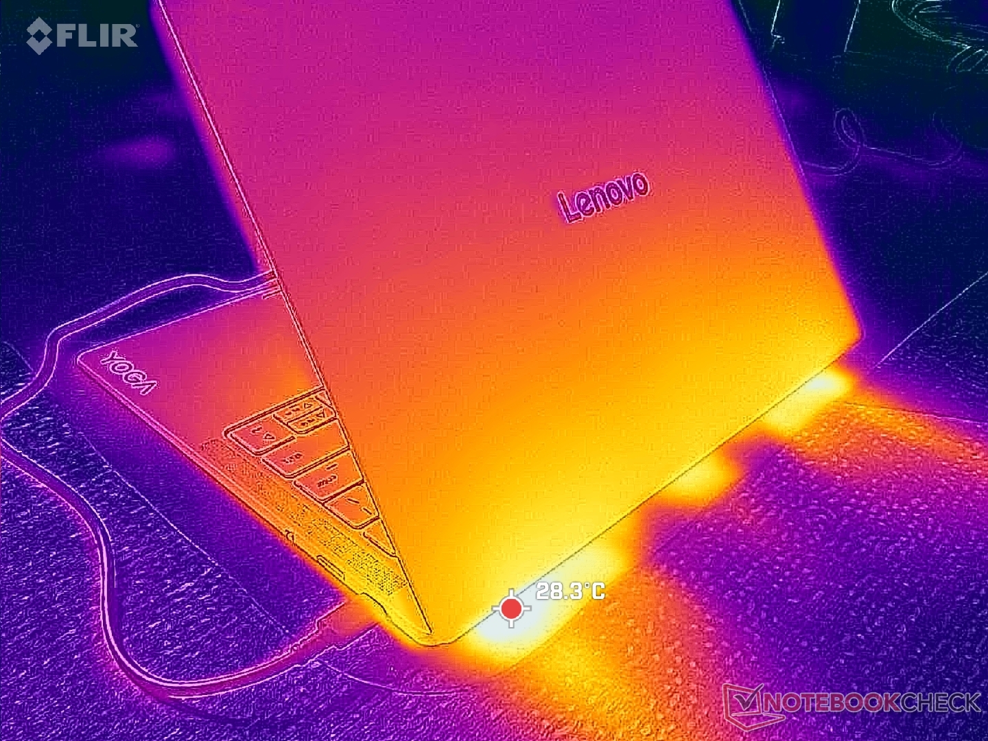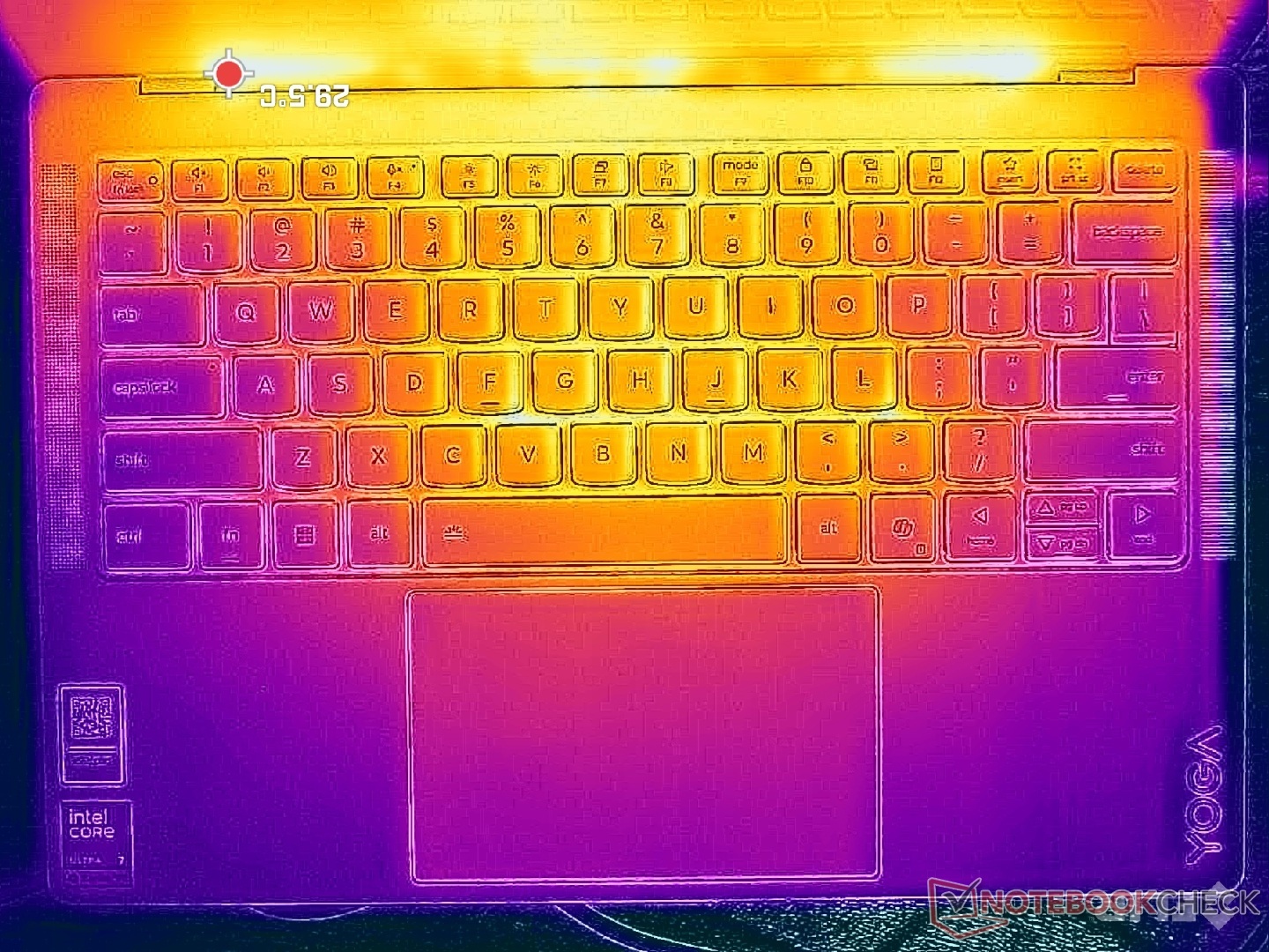 Les températures de surface sont relativement fraîches, même lorsque la charge est élevée. Les points chauds ne dépassent pas 34 °C, contre plus de 43 °C sur le HP OmniBook Ultra 14.