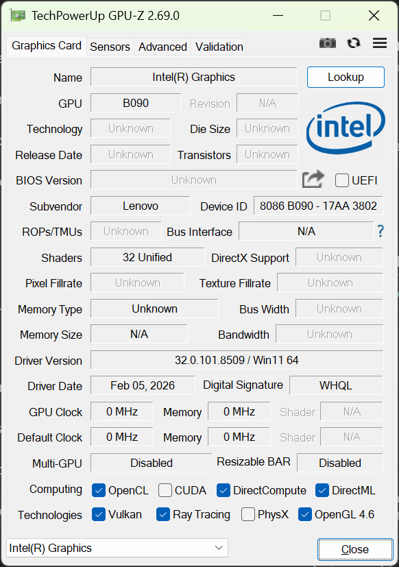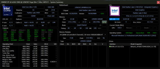 | Lenovo Yoga Slim 7 Ultra 14IPH11 Intel Core Ultra 7 355 ⎘ Intel Graphics 4 Xe3 Panther Lake iGPU ⎘ 32 Go Mémoire, 1024 Go SSD | Amazon: Prix de liste: 1700 USD | 978 g | 13.9 mm | 14.00" 2880x1800 243 PPI OLED | |