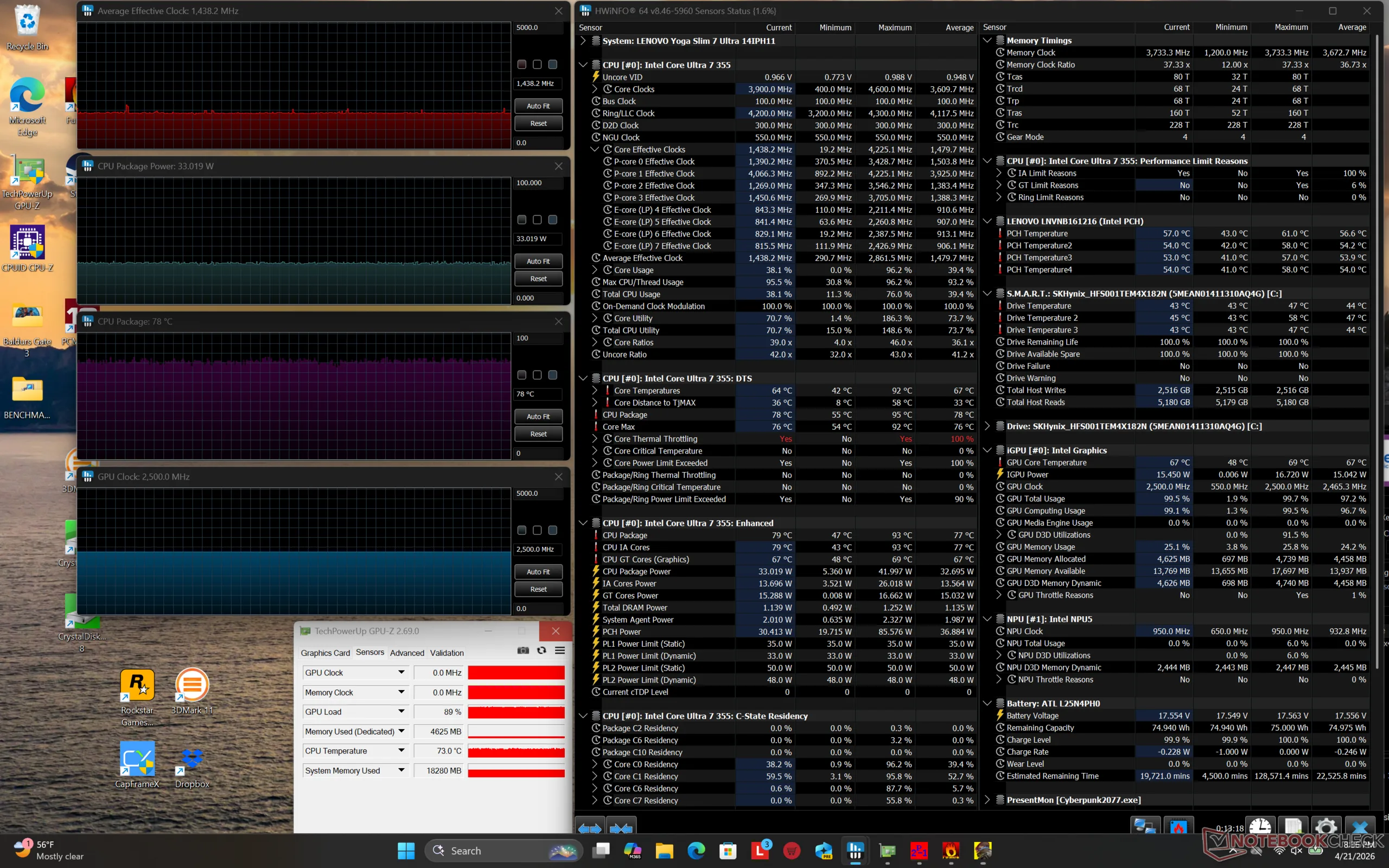 La fréquence d'horloge du GPU et la température lors de l'exécution de Cyberpunk 2077 se stabiliseraient à 2500 MHz et 78 C, respectivement, ce qui est presque exactement ce que nous avons enregistré sur le concurrent XPS 14 dans des conditions similaires.