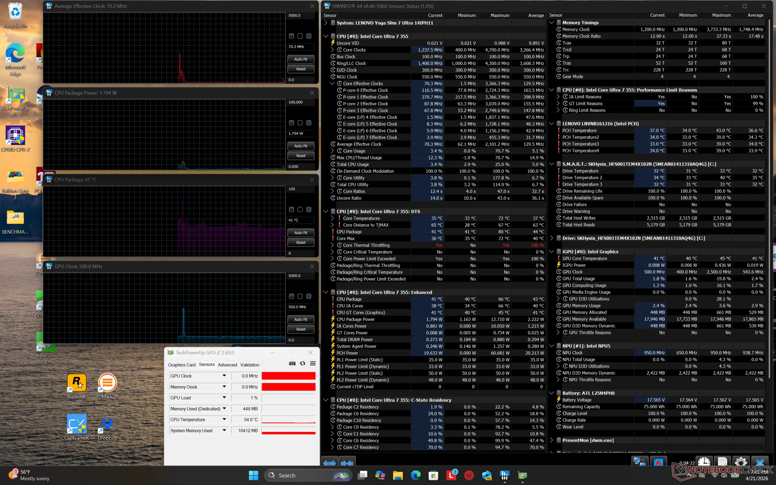 La consommation en mode Prime95 serait inférieure d'environ 12 % à celle de l'ordinateur de bureau AMD Yoga Slim 7a 14 même si notre processeur Intel est 20 % plus rapide pour une performance par watt supérieure à celle du concurrent Ryzen AI 400. De la même manière, les performances et la performance par watt sont légèrement en faveur d'Intel lorsque le GPU est sollicité.
