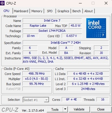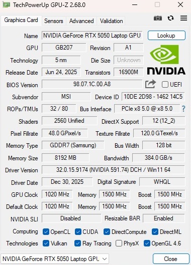 La puissance de la carte graphique mérite également d'être discutée : MSI n'accordant à la RTX 5050 qu'un maigre TGP de 45 watts, les performances du GPU ne sont pas à la hauteur de son potentiel, comme nous le montrerons au fil de l'article, bien que le développement du bruit soit limité. Le reste de l'équipement est solide, mais pas somptueux pour le prix, avec un Core 7 240H, 16 Go de RAM DDR5 (2x 8 Go) et un SSD de 512 Go. Le Cyborg 15 est également équipé d'une webcam avec volet de confidentialité, ce qui n'est pas une évidence pour les ordinateurs portables de jeu en particulier.