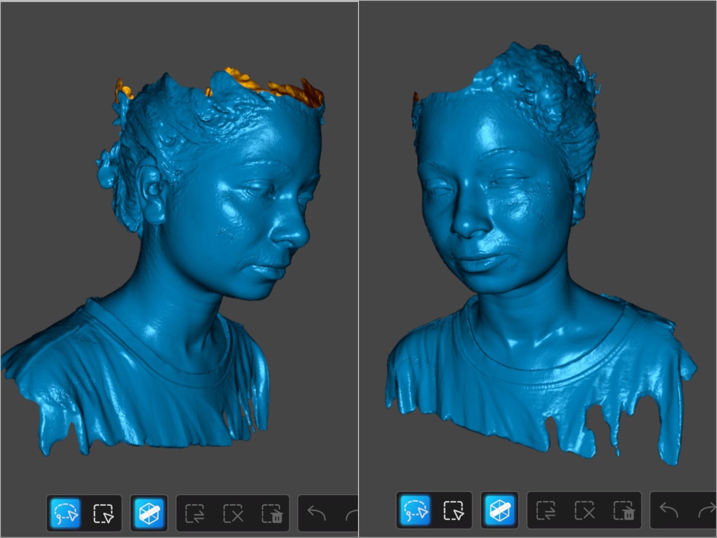 Enfin, pour tester le balayage infrarouge, nous avons utilisé un casque en mousse fait à la main représentant un ranger du jeu Anthem ainsi qu'un humain. Le scan NIR est rapide et, selon l'éclairage, il peut produire une carte de couleurs assez précise. Pour les scans humains, le Sermoon S1 a du mal avec les cheveux, mais c'est une limitation connue des scanners 3D.
