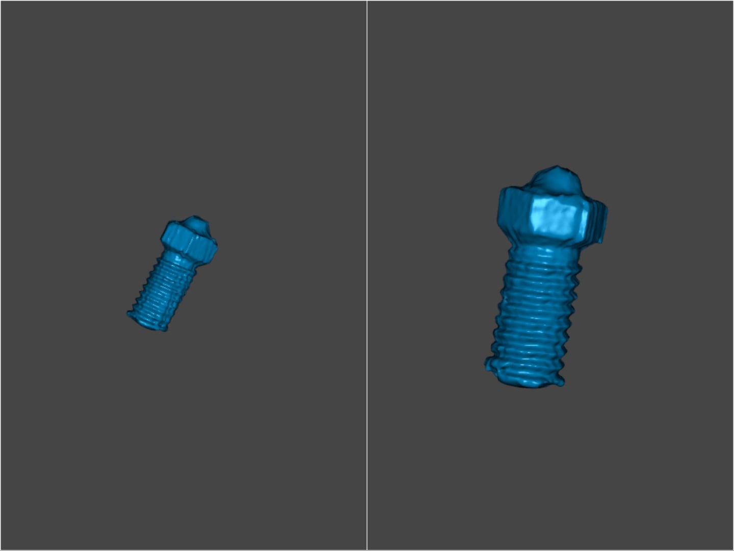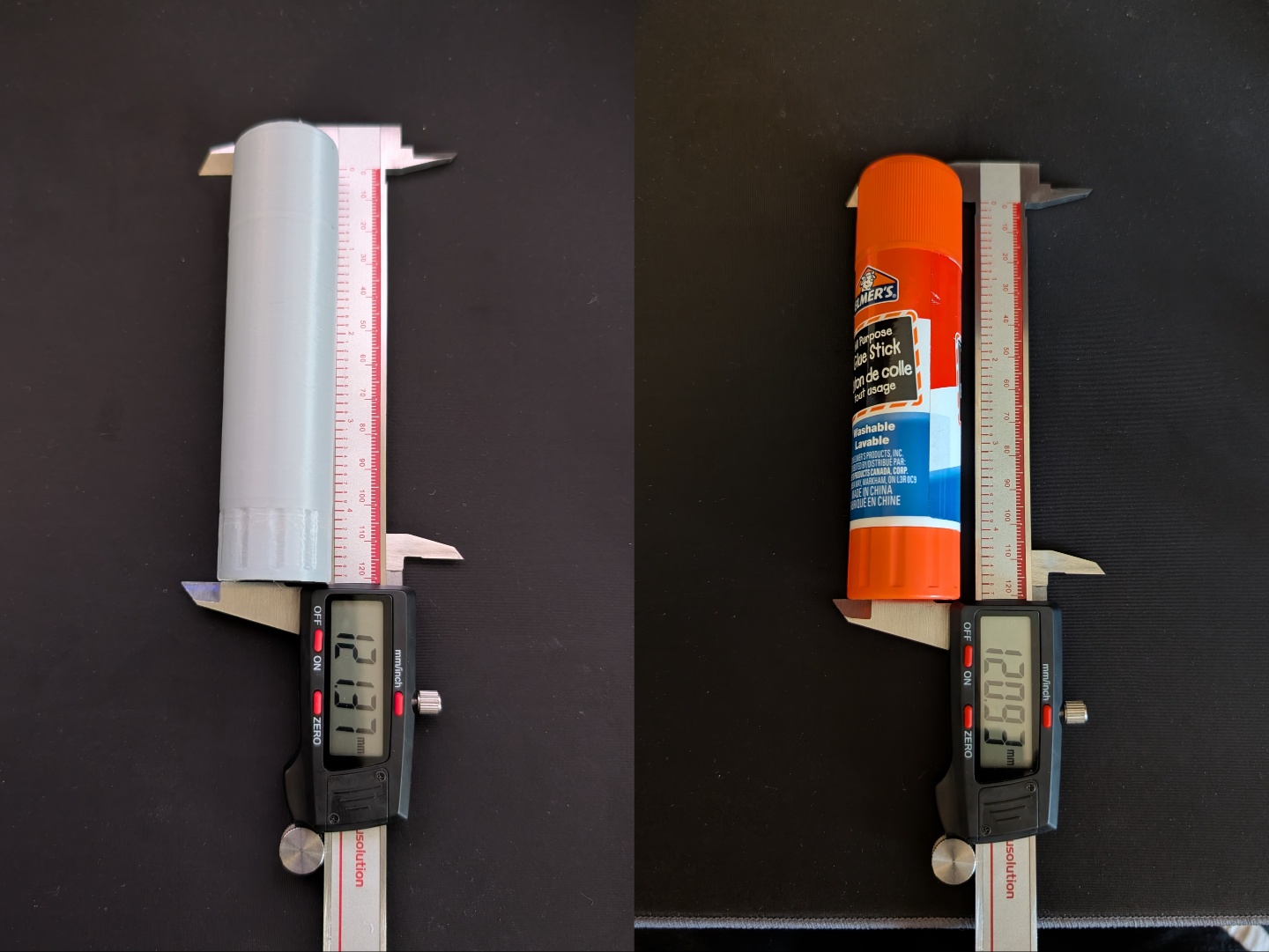 Cela dit, les résultats sont beaucoup plus précis pour les formes et les objets individuels. Le bâton de colle a été scanné à l'aide d'un laser parallèle et d'un laser simple, puis imprimé en 3D. Comme le montrent les images ci-dessous, la partie peu profonde était conforme à la précision annoncée, tandis que la partie plus profonde était décalée de 0,03 mm. Le diamètre était décalé de 0,04 mm, mais la hauteur était décalée de 0,24 mm, compte tenu de la présence d'une couche de 0,2 mm sur le bord du bâton.