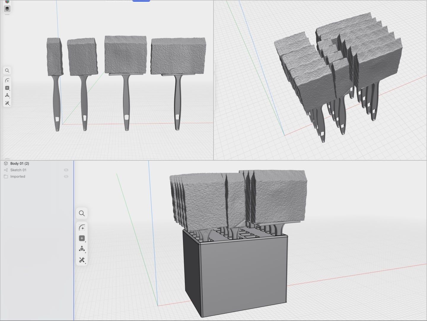 Pour des utilisations plus pratiques et organisationnelles, j'ai pu concevoir un support pour quelques brosses à mailles que j'avais en réserve. Le fait de disposer d'un modèle 3D des brosses de différentes tailles m'a permis de visualiser l'aspect qu'elles auraient dans un espace 3D, conformément à mes exigences de conception. Creality Scan, comme d'autres logiciels de numérisation 3D, dispose d'une fonction d'alignement qui permet de fusionner deux moitiés numérisées pour obtenir un modèle complet. Cela a permis de créer des modèles 3D précis pour les brosses. Ensuite, j'ai pu concevoir rapidement un support de souris pour organiser mon bureau en scannant le dessous de la souris, et je suis passé de la numérisation à la conception et à l'impression d'un prototype en moins de 30 minutes.