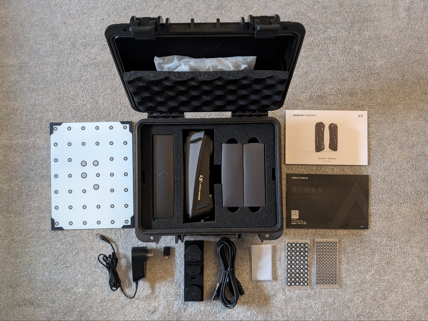 Le Sermoon S1 est emballé en toute sécurité dans une mallette Pélican, ce qui le rend facile à ranger et à transporter. Les câbles et l'adaptateur d'alimentation sont découpés dans la mousse, et il y a une poche sur le couvercle pour toute la documentation et les nombreux marqueurs. La mallette pélican contient également la carte d'étalonnage au fond, soigneusement cachée car elle n'est pas souvent utilisée.