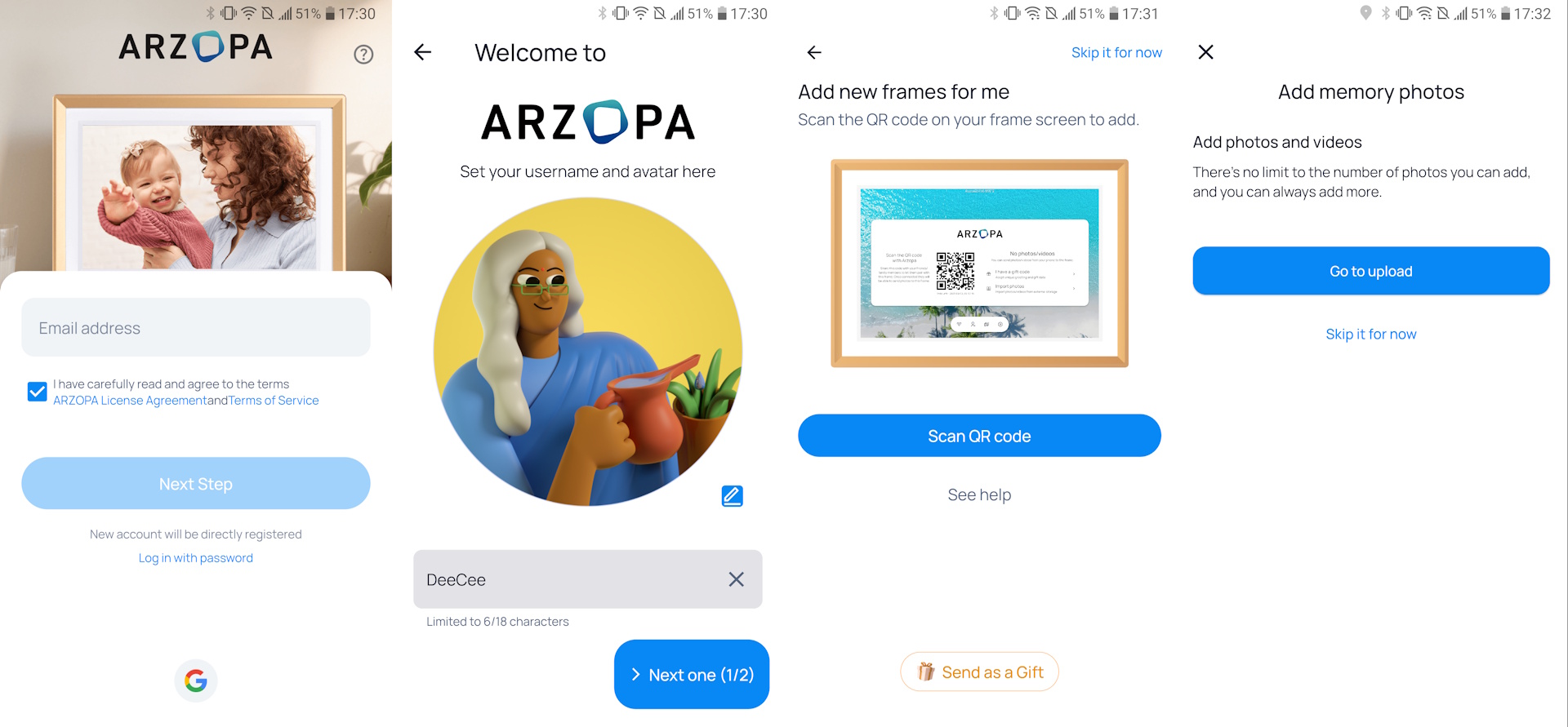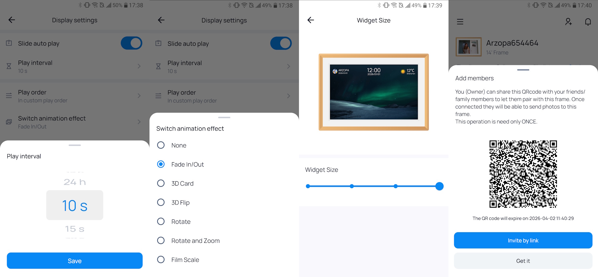 Le logiciel est facile à installer et l'ajout d'une photo ne prend que quelques secondes. L'accès au cadre Arzopa peut être partagé avec les amis et la famille, ce qui permet à chacun de télécharger des photos à distance via l'application. L'application permet également aux acheteurs de précharger une bénédiction et une photo avant de l'offrir, et les propriétaires peuvent ajouter des codes cadeaux pour importer des photos d'événements supplémentaires.