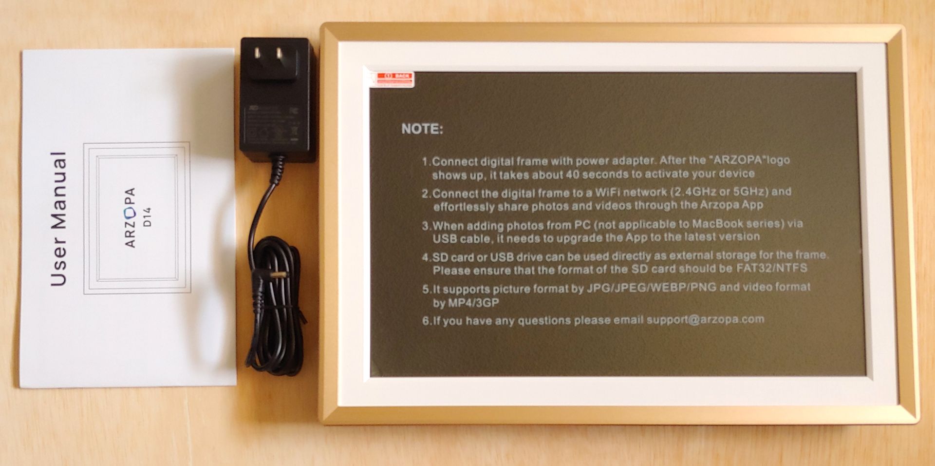 L'Arzopa était livré avec un adaptateur secteur et un manuel d'utilisation.