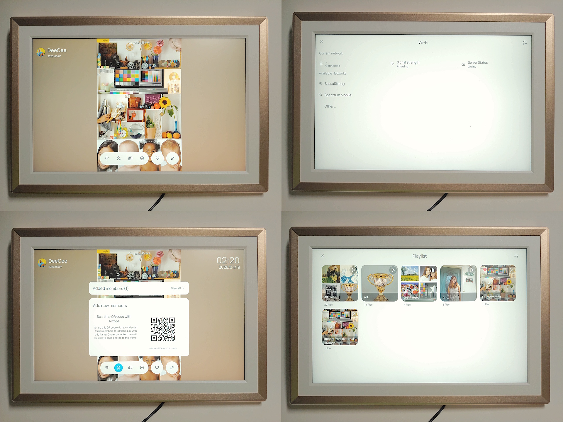 Les paramètres Wi-Fi facilitent l'ajout d'une nouvelle connexion, bien que les réseaux proxy ne soient pas pris en charge. Les paramètres utilisateur permettent d'ajouter rapidement de nouveaux membres qui peuvent télécharger des photos à distance. Le menu Photos permet aux utilisateurs de lire des médias à partir d'une carte SD, de transférer des fichiers via USB, de supprimer des éléments ou de réinitialiser le cadre, avec des dossiers disponibles pour organiser de grandes bibliothèques. Les paramètres du système contrôlent la luminosité, le volume, la lecture automatique des photos et la gestion des fichiers.