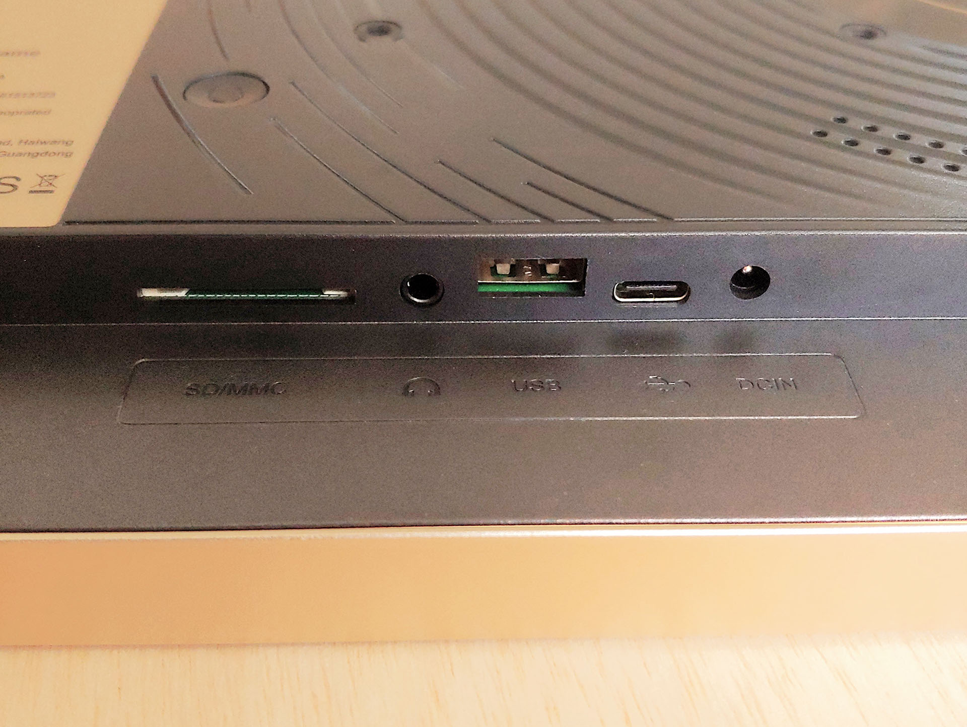 Tous les ports (alimentation, USB-A, USB-C, emplacement pour carte SD et prise casque de 3,5 mm) se trouvent à l'arrière. Comme il n'y a pas de bouton d'alimentation, il suffit de le brancher pour l'allumer, et l'arrêt ou la mise en veille sont gérés par le menu.