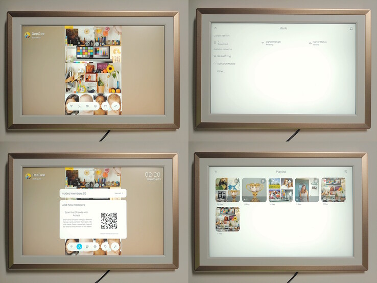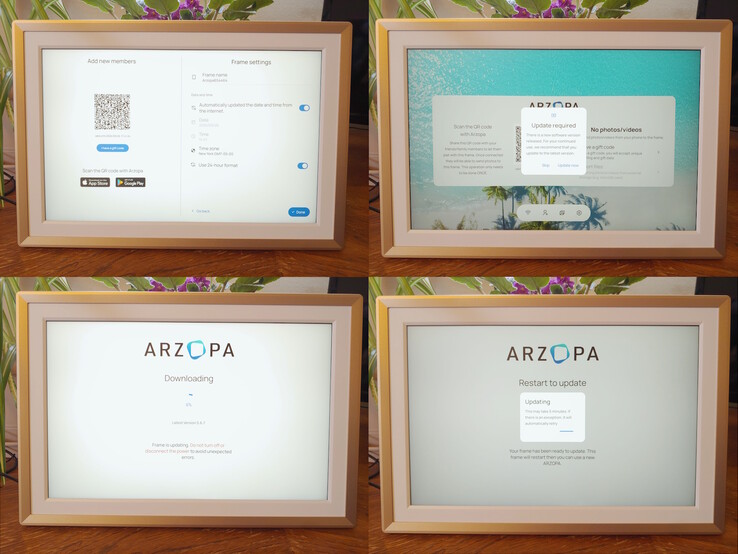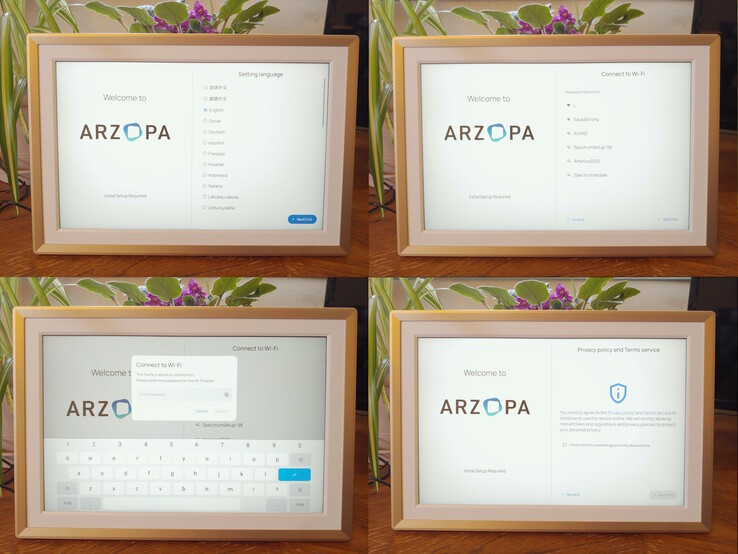 La configuration initiale du matériel se compose de plusieurs écrans, dont la sélection de la langue, la configuration du Wi-Fi en option, l'acceptation des conditions de service et des politiques de confidentialité, ainsi que le réglage de l'heure et de la date. Les utilisateurs peuvent partager le code QR affiché sur le dernier écran avec leurs amis et leur famille pour accéder au cadre photo ou ajouter un code cadeau pour voir les photos offertes, par exemple celles d'un mariage. Une mise à jour du micrologiciel a été nécessaire sur l'appareil examiné et son installation a pris plusieurs minutes.