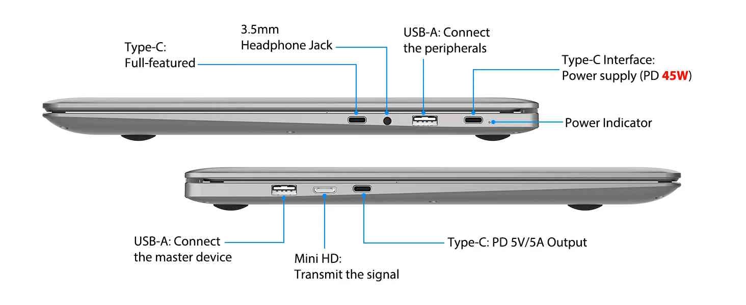 Le clavier est de type QWERTY et comprend un pavé numérique et un pavé tactile. L'appareil peut recevoir à la fois de l'énergie électrique et des signaux d'image via l'USB-C. Il y a au total trois ports USB-C et un port mini HDMI. Les autres ports comprennent deux ports USB-A, une sortie jack et deux haut-parleurs. Le modèle pèse 1545 grammes et mesure 372 × 244 × 26 millimètres. Vous trouverez plus de détails sur la page produit https://www.elecrow.com/crowview-note-15-6-all-in-one-portable-monitor-phone-to-laptop-device.html?idd=6.