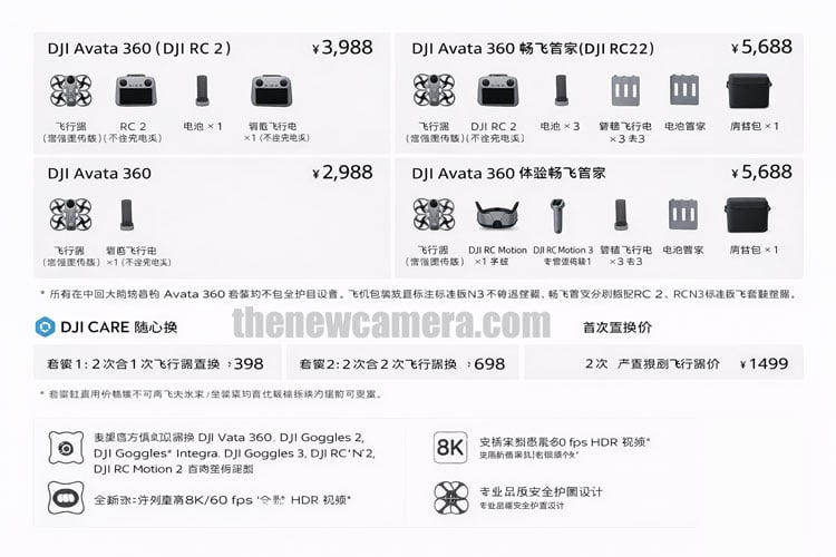 Selon les informations obtenues par diverses sources, l'Avata 360 sera proposé à partir de CNY 2,988 (~$428) avec une simple batterie. Cependant, le drone sera également disponible au prix de CNY 3,988 (~$571) avec une batterie et une télécommande RC 2. Par ailleurs, DJI facturera 5 688 CNY (~814 $) pour le même drone avec une télécommande RC 2 ou un Goggles N3 et d'autres accessoires.
