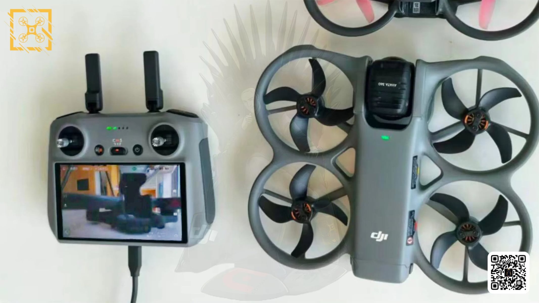 De nouvelles photos ont confirmé que ces spéculations étaient exactes. Bien qu'elle ne soit pas entièrement visible sur la photo du haut, la photo intégrée ci-dessus montre l'Avata 360 avec un objectif de caméra orienté vers l'intérieur et l'autre vers l'extérieur. De plus, la télécommande située à côté montre son flux en direct avec une image normale visible au lieu d'un équivalent à 360°.