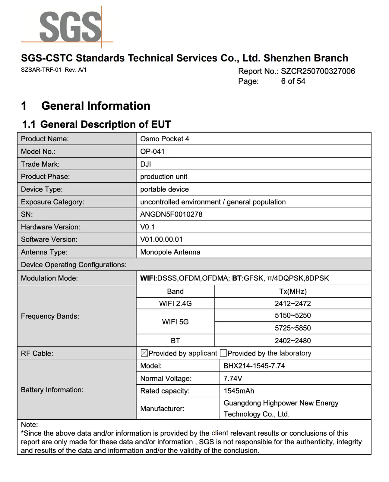 La prise en charge de Bluetooth Low Energy est également de retour. Cependant, il reste à voir si l'Osmo Pocket 4 ira au-delà de la norme BLE 5.2 que DJI a accordée à son prédécesseur. Quoi qu'il en soit, la FCC indique que l'Osmo Pocket 4 sera lancé avec une batterie considérablement améliorée. Jusqu'à présent, la FCC n'a révélé qu'une batterie d'une capacité nominale de 1 545 mAh.