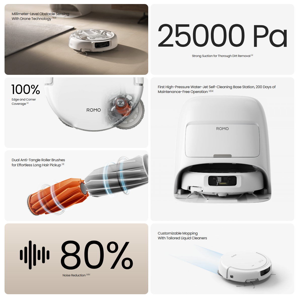 Les caractéristiques de nettoyage sont assez impressionnantes pour un appareil grand public. Romo annonce une aspiration de 25 000 Pa et un débit d'air de 20 L/s, deux moteurs à rouleaux à grande vitesse pour la gestion des poils et un réservoir d'eau embarqué de 164 ml qui ajuste automatiquement le débit. Deux bras latéraux flexibles s'étendent pour atteindre les coins et s'adaptent en temps réel, tandis que le contrôle adaptatif de la brosse réduit la propagation des débris lorsque vous rencontrez de la litière, comme celle d'un chat. DJI a également inclus une base de lavage automatique : quatre buses à haute pression, une grande sortie de déchets de 16 mm et une force de descente de 12 N sur les tampons, ce qui, selon la société, peut réduire l'entretien des tampons jusqu'à 200 jours dans les conditions d'essai.