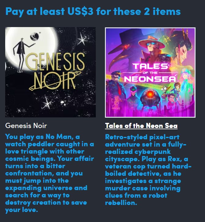 - Tales of the Neon Sea: Ce jeu point-and-click rétro-pixel vous plonge dans une ville cyberpunk éclairée au néon où vous incarnez le détective Rex. Vous chassez des indices et résolvez une affaire de meurtres en série datant de 13 ans. Tales of the Neon Sea coûte 16,99 $ sur Steam et compte actuellement 4 500 avis, dont 87 % sont positifs.