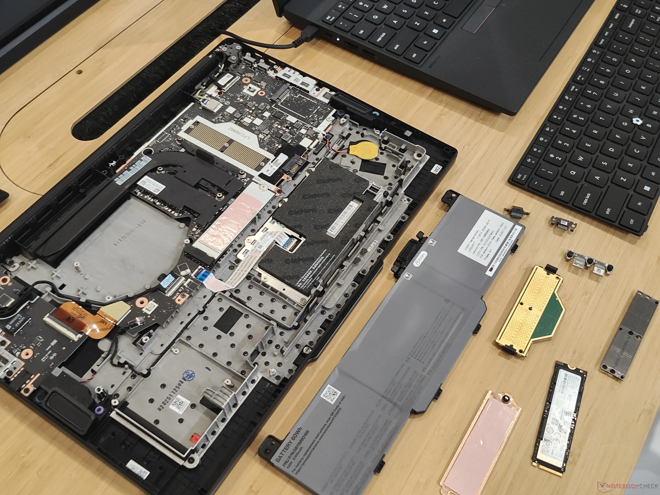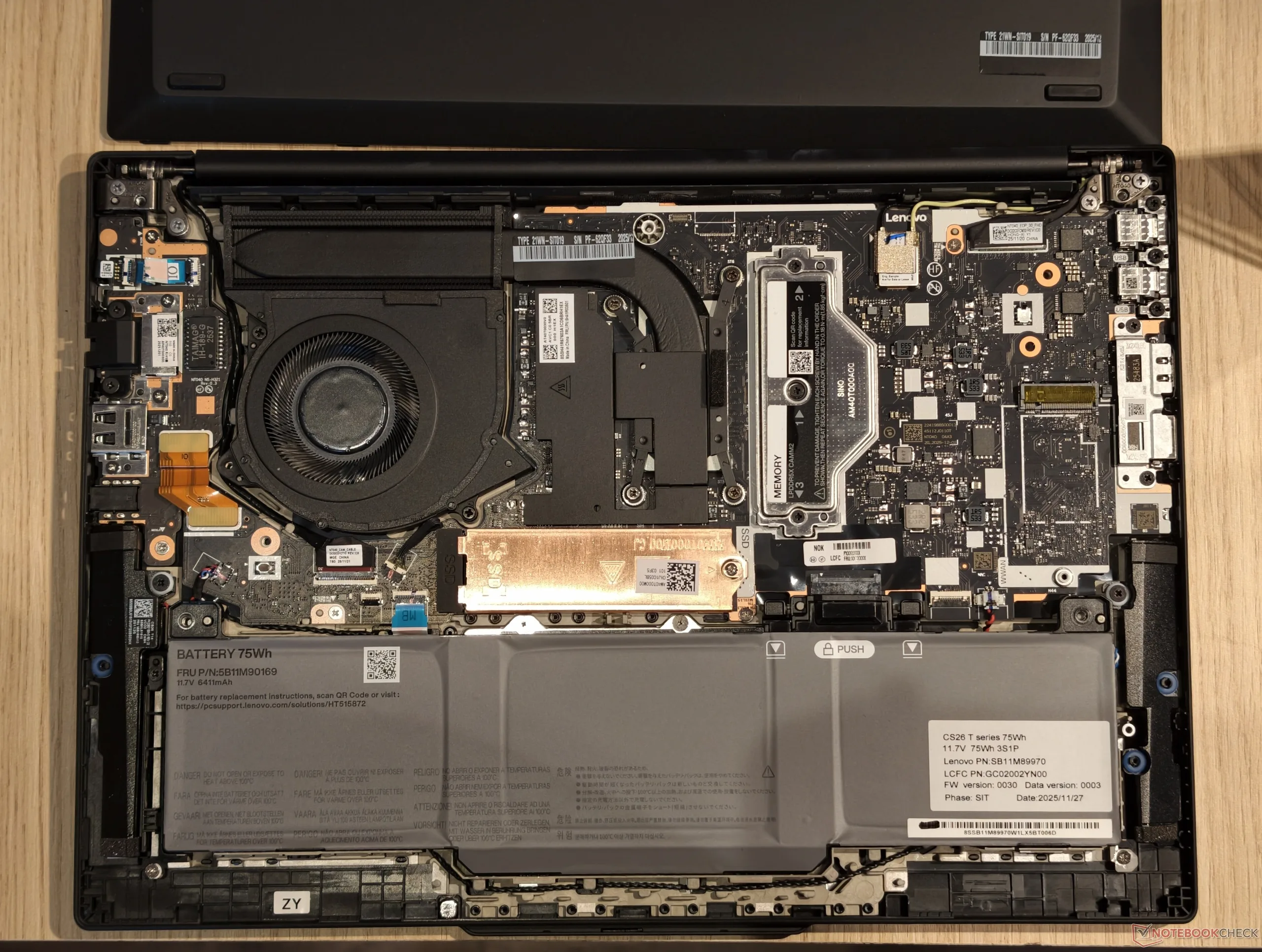 De plus, les ports de charge USB-C, d'une importance capitale, sont désormais modulaires et remplaçables par l'utilisateur. Lenovo est même allé jusqu'à faire du ventilateur une pièce distincte du dissipateur thermique, ce qui permet aux utilisateurs de nettoyer le ventilateur sans avoir à recoller le CPU. Lenovo a également pensé à quelques détails intéressants : Une fois que la dernière vis du couvercle inférieur, celle du centre entre les charnières, a été ouverte, le couvercle inférieur se détache de lui-même dans la partie centrale - pas besoin d'un tournevis. Dans l'ensemble, il n'est pas surprenant que le T14 Gen 7 et le T16 Gen 5 obtiennent une note de 10/10 sur l'échelle de réparabilité iFixit.