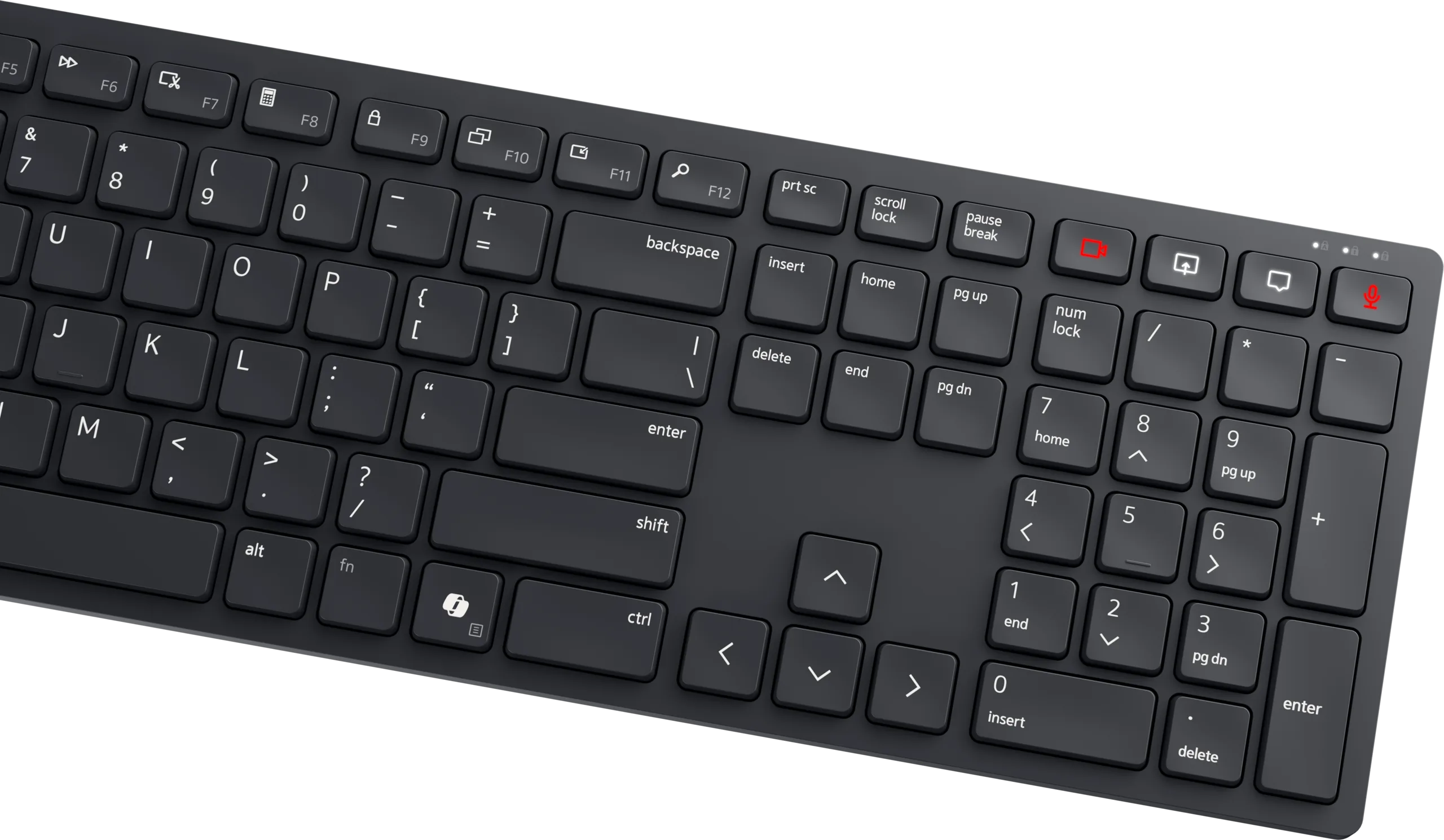 Ce qui distingue ce clavier, c'est l'ensemble des touches dédiées à la visioconférence qui se trouvent au-dessus du pavé numérique. Ces touches permettent de couper l'audio, d'activer et de désactiver la vidéo, de démarrer un partage d'écran et d'ouvrir le chat. Les touches de coupure de l'audio et de la vidéo sont également rétroéclairées en rouge et en blanc pour indiquer que l'audio est désactivé ou activé, respectivement. Ces touches sont compatibles avec Zoom et Microsoft Teams.