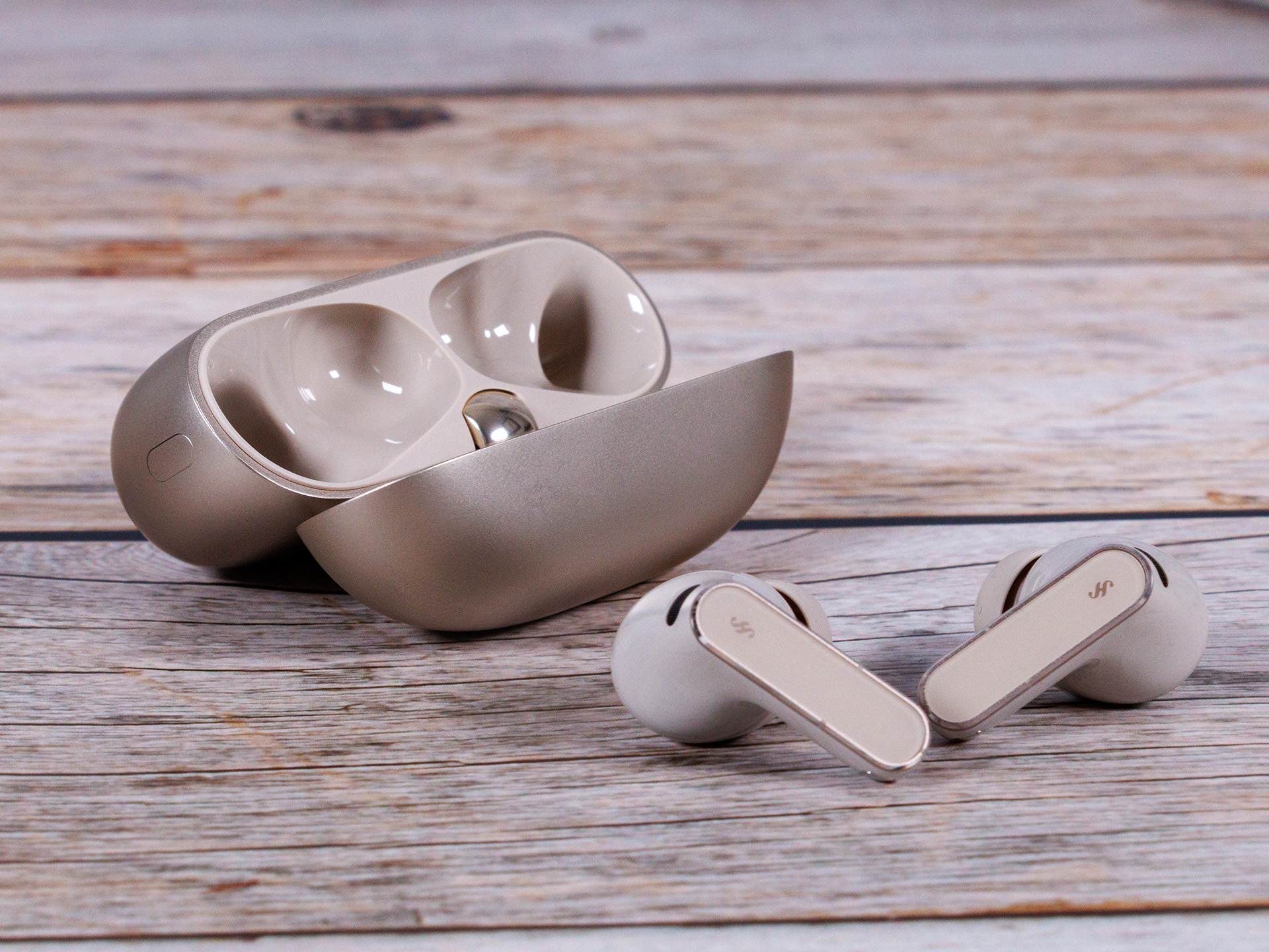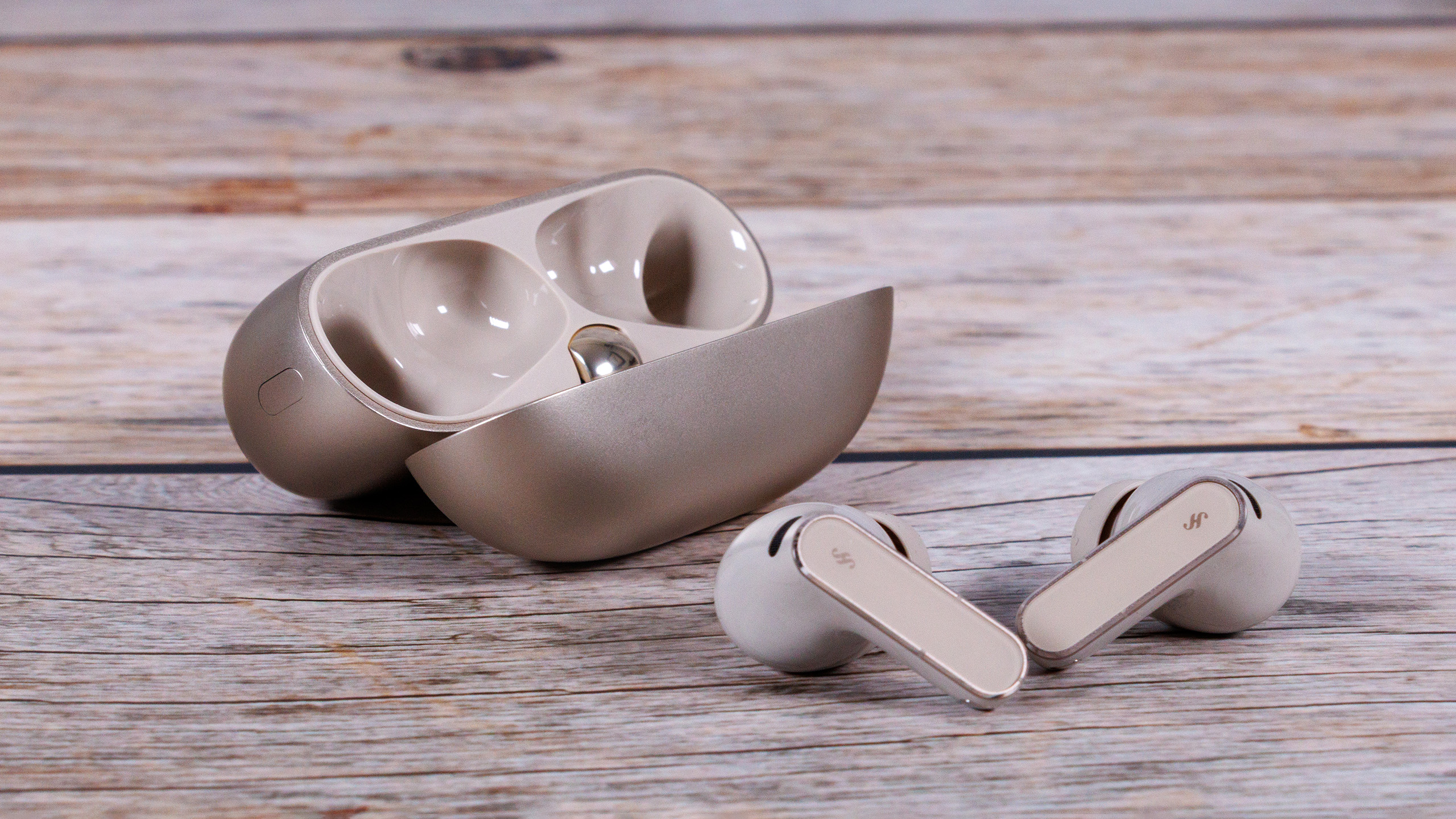 Les Huawei FreeBuds Pro 5 sont légèrement plus compacts et plus arrondis que leurs prédécesseurs, et les écouteurs pèsent 0,3 gramme de moins. L'étui de charge est également plus léger de 4 grammes, à moins que vous n'optiez pour la version bleue, auquel cas il ne pèse qu'un gramme de moins. Les options de couleur comprennent le blanc, le noir, l'or sable (notre unité d'évaluation) et le bleu foncé. Dans ce dernier cas, l'étui est recouvert d'une couche de faux cuir texturé.