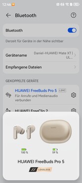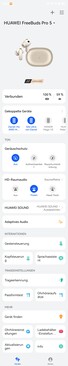 La configuration des Huawei FreeBuds Pro 5 est simple grâce à l'appairage Bluetooth. Grâce à Microsoft Swift Pair, l'appairage se fait automatiquement sur les PC dès que l'étui de chargement est ouvert pour la première fois ; il en va de même pour les smartphones et tablettes Huawei. Google Fast Pair n'étant pas pris en charge, le processus d'appairage doit être lancé manuellement dans ce cas. Grâce à la prise en charge multipoint, deux appareils peuvent être appariés simultanément et la liste d'appairage peut gérer jusqu'à huit appareils.