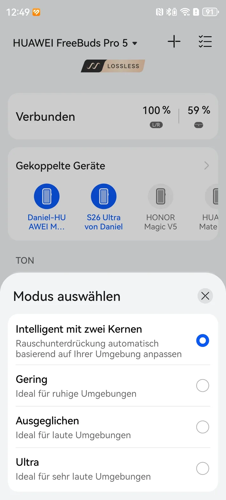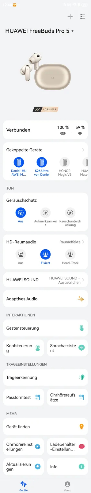 Dans l'application, vous pouvez gérer les appareils couplés, installer des mises à jour, configurer l'égaliseur, configurer l'audio spatial et bien plus encore. Le codec AAC est disponible pour les appareils Apple, tandis que les appareils Android peuvent utiliser LDAC. Les propriétaires de smartphones ou de tablettes Huawei ont également accès au streaming sans perte, qui prend actuellement en charge jusqu'à 2,3 Mbps sur les modèles les plus récents. En revanche, les propriétaires des modèles de l'année dernière doivent soudain se contenter de L2HC 3.0 ou de 1,5 Mbps. C'est le cas, entre autres, du Pura 70 Ultra et du Mate XTqui pouvaient jusqu'à présent utiliser les FreeBuds Pro 4 à 2,3 Mbps. La raison pour laquelle Huawei dégrade ainsi artificiellement ses propres produits reste un mystère pour nous.