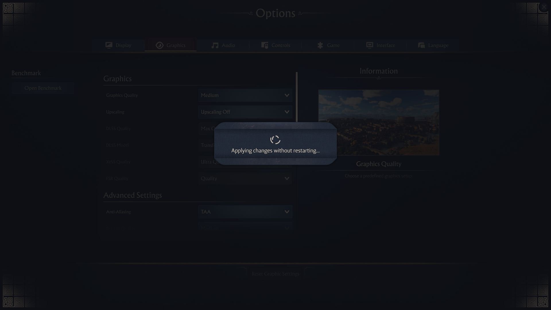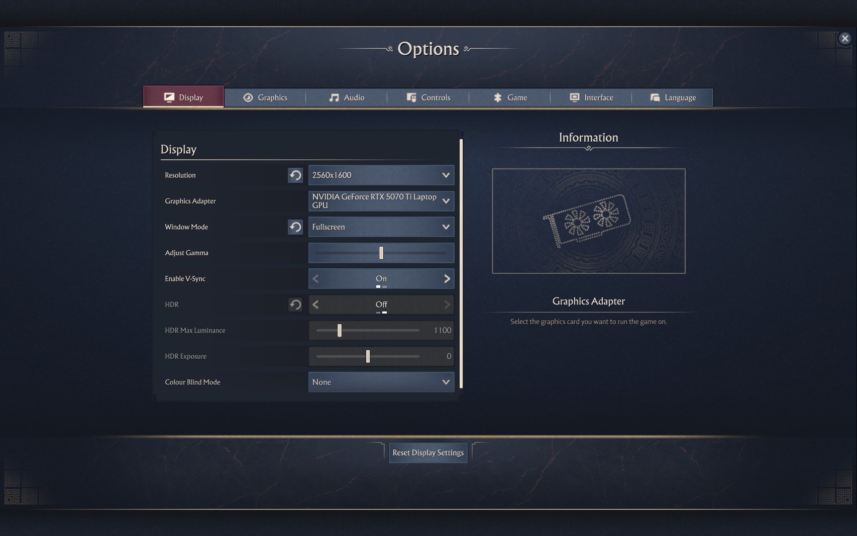Le menu d'options en deux parties (affichage et paramètres graphiques) offre tous les choix habituels et, heureusement, applique les changements sans nécessiter de redémarrage. L'application de nouveaux paramètres pour la première fois peut toutefois prendre un peu plus de temps ; dans notre cas, nous avons dû attendre jusqu'à une minute.