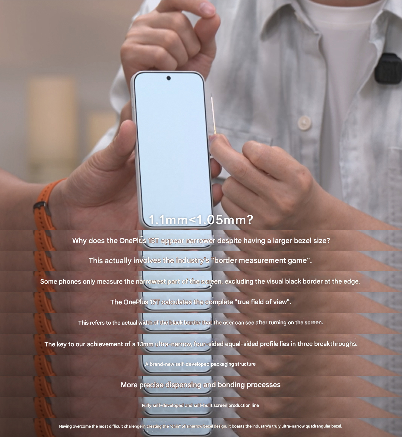 Lorsque l'attention s'est portée sur la face avant, OnePlus a parlé des bordures du smartphone. Elles font 1,1 mm d'épaisseur, mais la marque affirme que les bordures paraîtront plus fines qu'un téléphone avec des bordures de 1,05 mm. C'est le résultat d'une toute nouvelle structure d'emballage, avec un "processus de distribution et de collage plus précis"