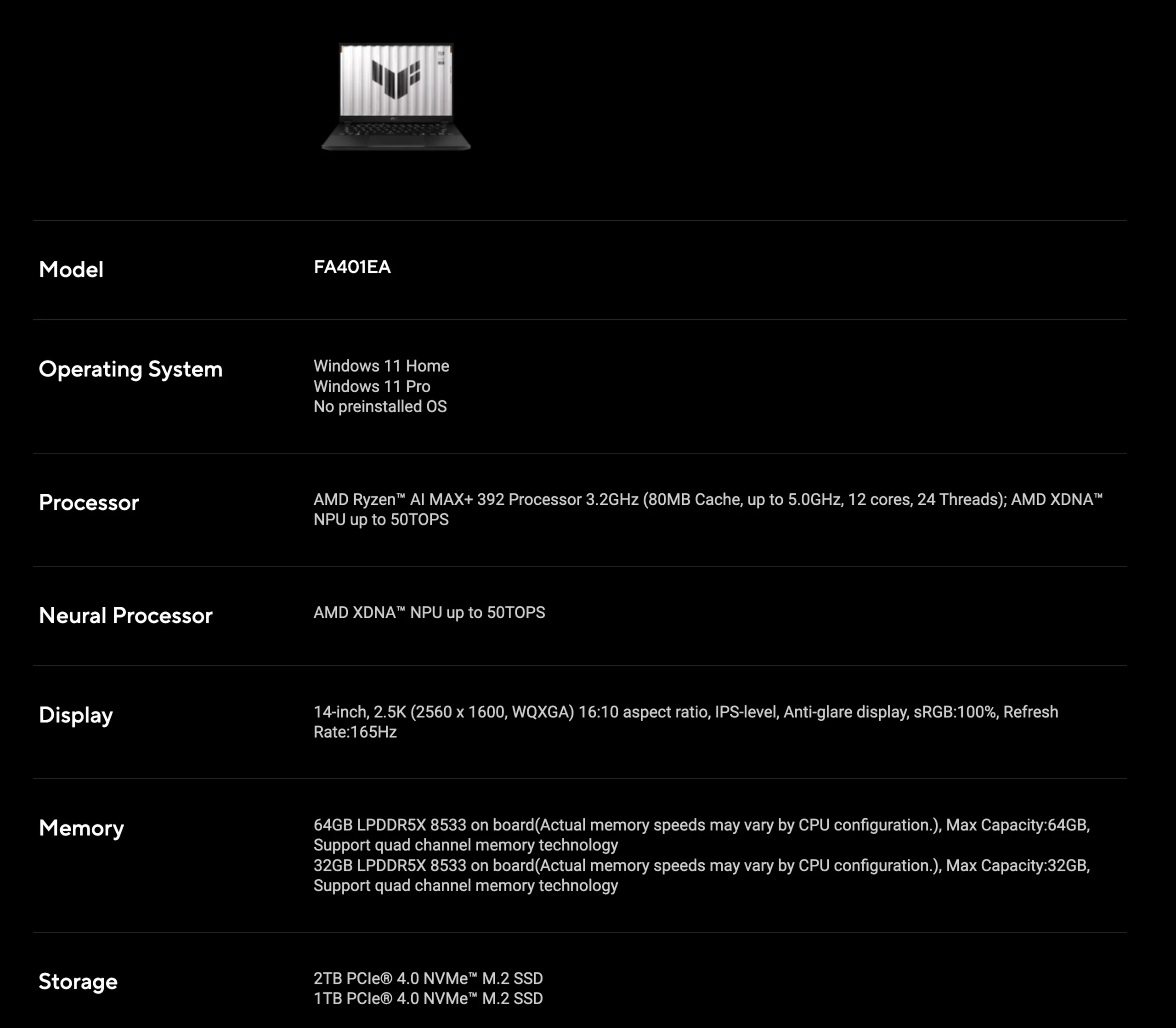 Initialement, Asus avait déclaré qu'il proposerait le TUF Gaming A14 FA401EA avec jusqu'à 32 Go de RAM. Asus a mis à jour l'ordinateur portable avec une deuxième configuration de mémoire, que l'on peut déjà voir sur Geekbench. Comme le montre l'image ci-dessous, Asus propose désormais jusqu'à 64 Go de RAM et un SSD de 2 To. Ainsi, le TUF Gaming A14 FA401EA devrait être capable de mettre 48 Go de VRAM pour sa Radeon 8060S iGPU. Malheureusement, le prix et la disponibilité restent inconnus à ce stade.