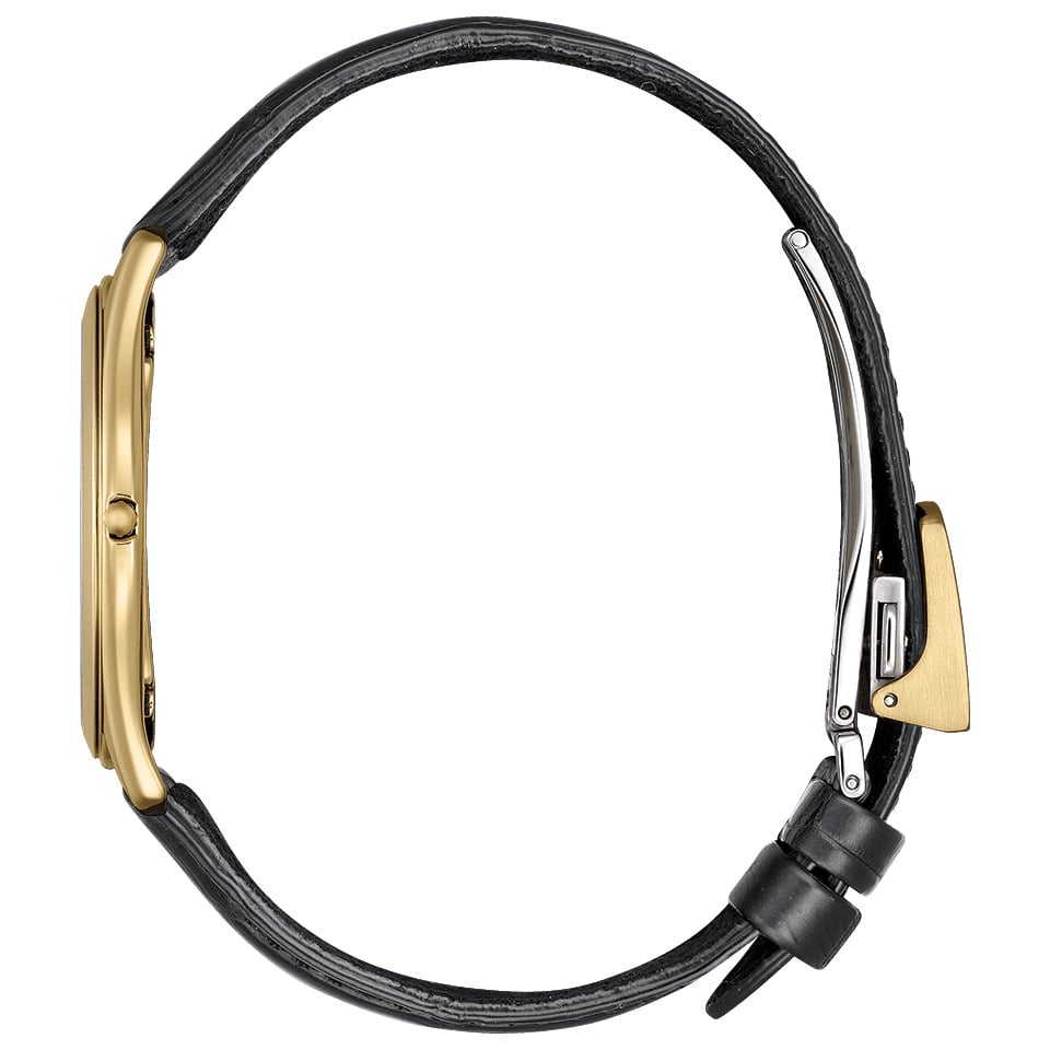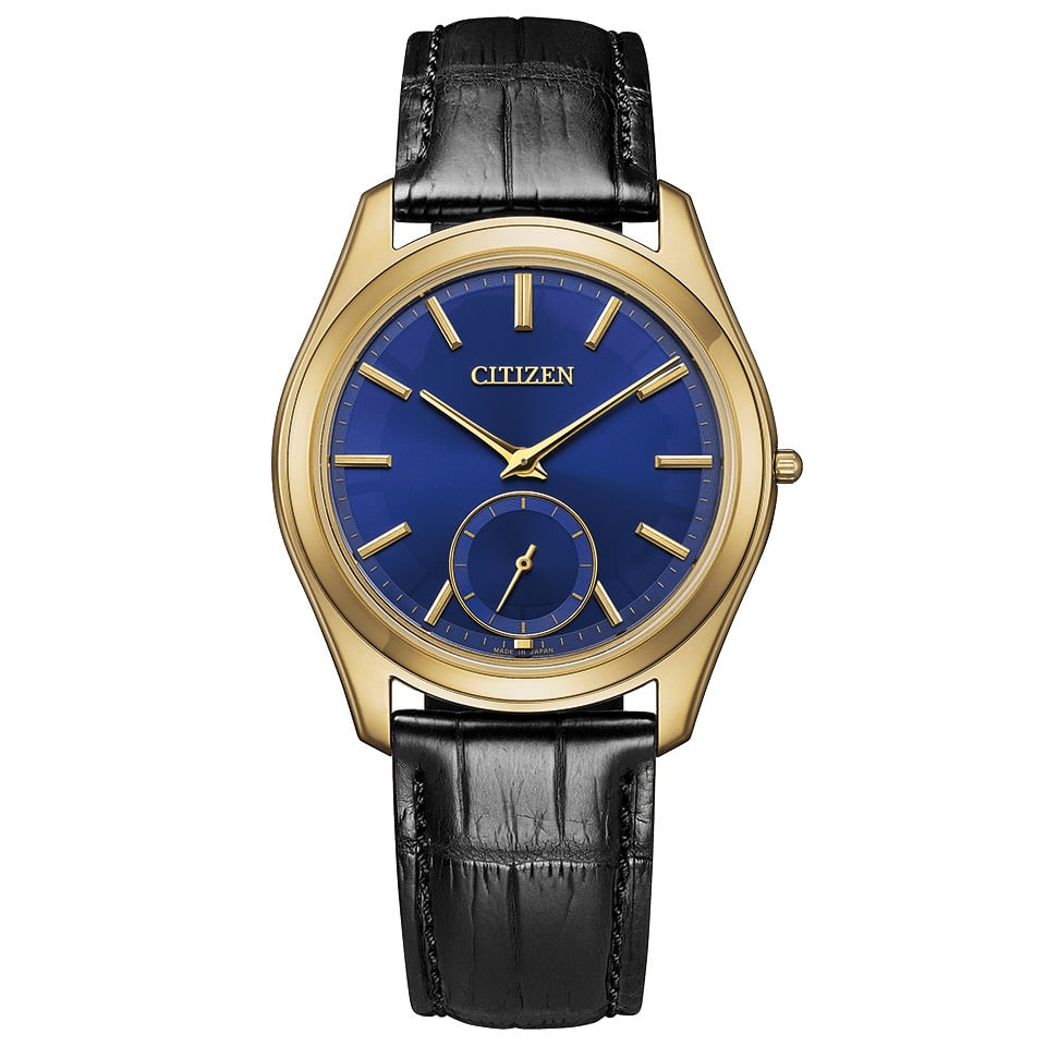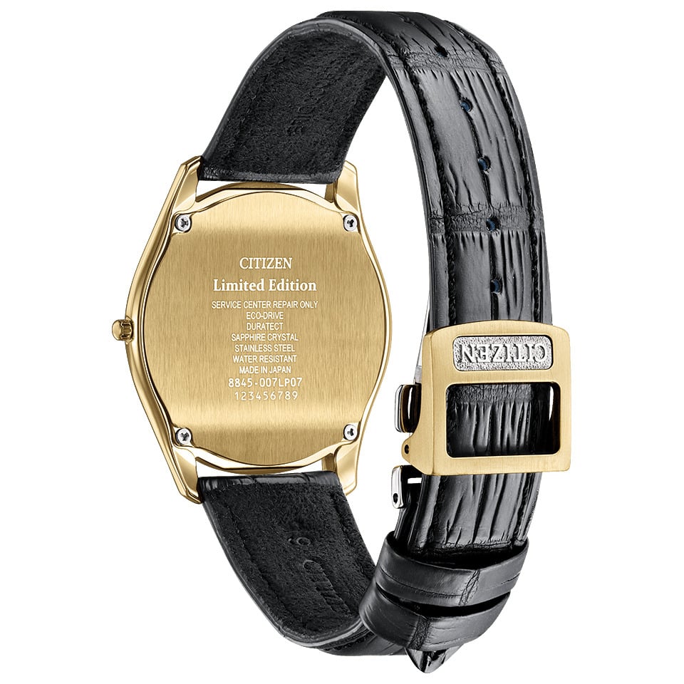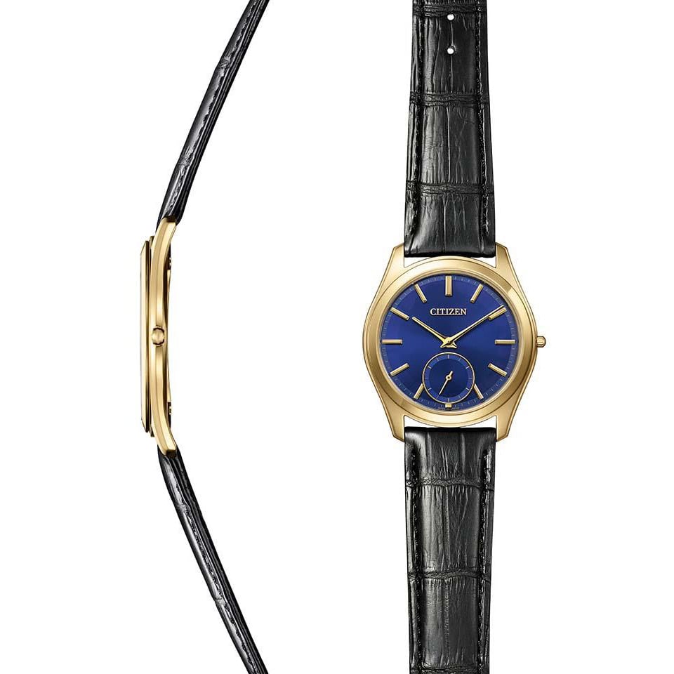 La deuxième montre dévoilée est la Citizen Eco-Drive One AQS0202-02L. Ce modèle prend une direction beaucoup plus minimale. Il est réalisé en or teinté d'ambre sur acier inoxydable, avec un cadran bleu profond et des index bâtons appliqués. Son boîtier de 36,6 mm ne fait que 4,5 mm d'épaisseur, ce qui en fait l'un des modèles solaires les plus minces de Citizen. Elle est alimentée par le calibre 8845 Eco-Drive, qui utilise la lumière pour se recharger, éliminant ainsi le besoin de remplacer la pile. Au lieu d'un bracelet, la montre est livrée avec un bracelet en cuir noir et une boucle en or assortie. Cette version est limitée à 250 exemplaires et le numéro d'édition est gravé sur le fond du boîtier.