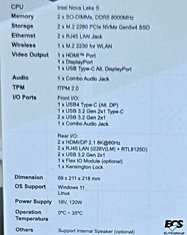 Basé sur la plateforme B960, le mini PC Nova Lake d'ECS supportera des modules de mémoire vive DDR5-8000 via deux emplacements SO-DIMM, ainsi que deux SSD M.2 2280 PCIe 5.0 du côté du stockage.