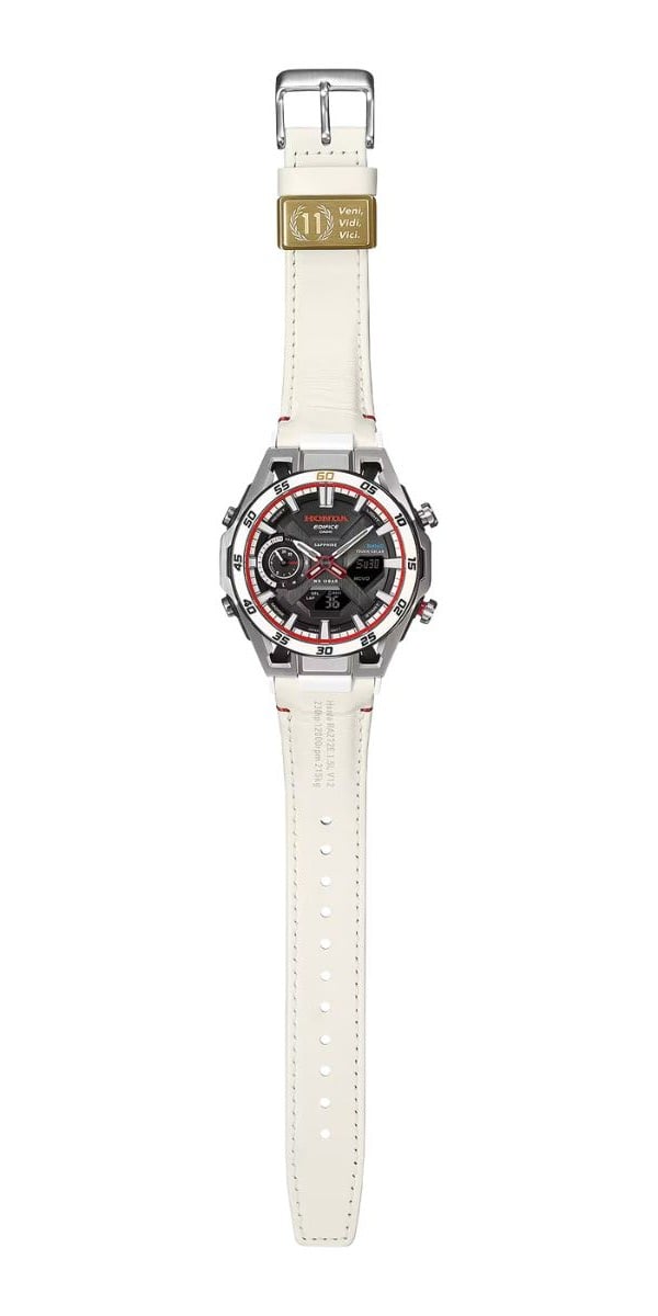 La Casio Edifice Sospensione ECB-2300HR-1A célèbre le 60ème anniversaire de la première victoire de Honda en F1 avec la RA272 lors du Grand Prix du Mexique en 1965. La lunette et le bracelet en cuir de la montre sont de couleur Championship White, assortie à la teinte de la carrosserie de la voiture. Ce modèle a un cadran noir avec des accents rouges. D'autres clins d'œil à la voiture victorieuse incluent un repère 60 en or sur la lunette, le plan du moteur est imprimé sur le côté intérieur du bracelet de la montre et les mots Veni, Vidi, Vici sont gravés sur la boucle du bracelet en métal.